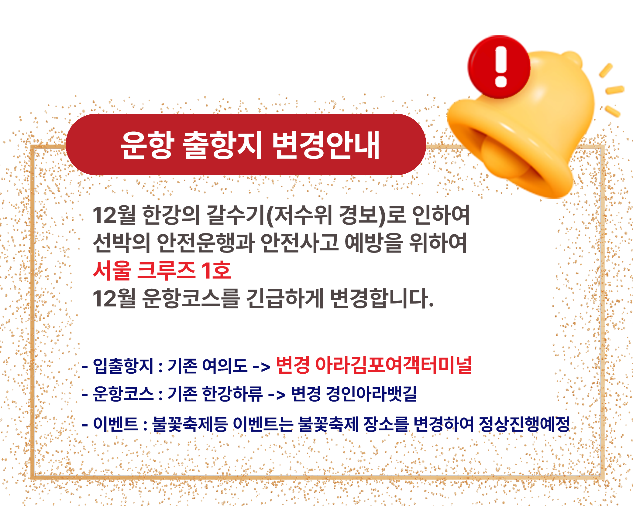 한강방류, 기상악화, 선박사정 등으로 한강 운항이 불가능할 경우 아라뱃길 코스로 진행되며, 이로 인한 환불 및 요금 인하는 없습니다.