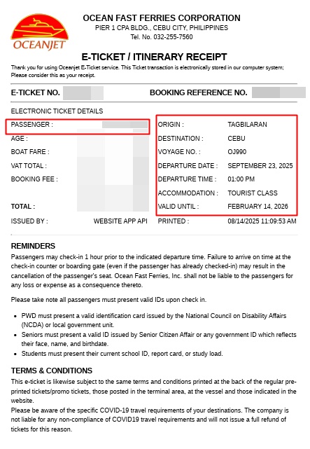 출발 당일, 해당 항구(세부 Pier 1 또는 보홀 탁빌라란)의 오션젯 매표소에 바우처와 여권 제시.