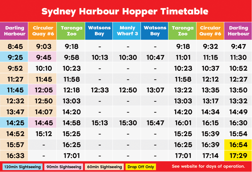 에코호퍼 페리를 이용을 하시면 타롱가동물원을 오시는 길 또한 여행이 됩니다. 에코호퍼 퍼리는 타롱가주를 오는 페리 뿐만이 아니라 맨리-달링하버, 하버비치페리, 맨리-서큘러키 루트를 24시간 동안 이용 가능 합니다. 아래 시간표와 루트를 참고해 주세요