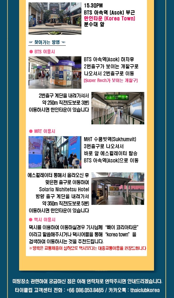 • 15:30 BTS 아속역 2번 출구/MRT 수쿰빗역 3번 출구, 한인타운 분수대 앞 미팅