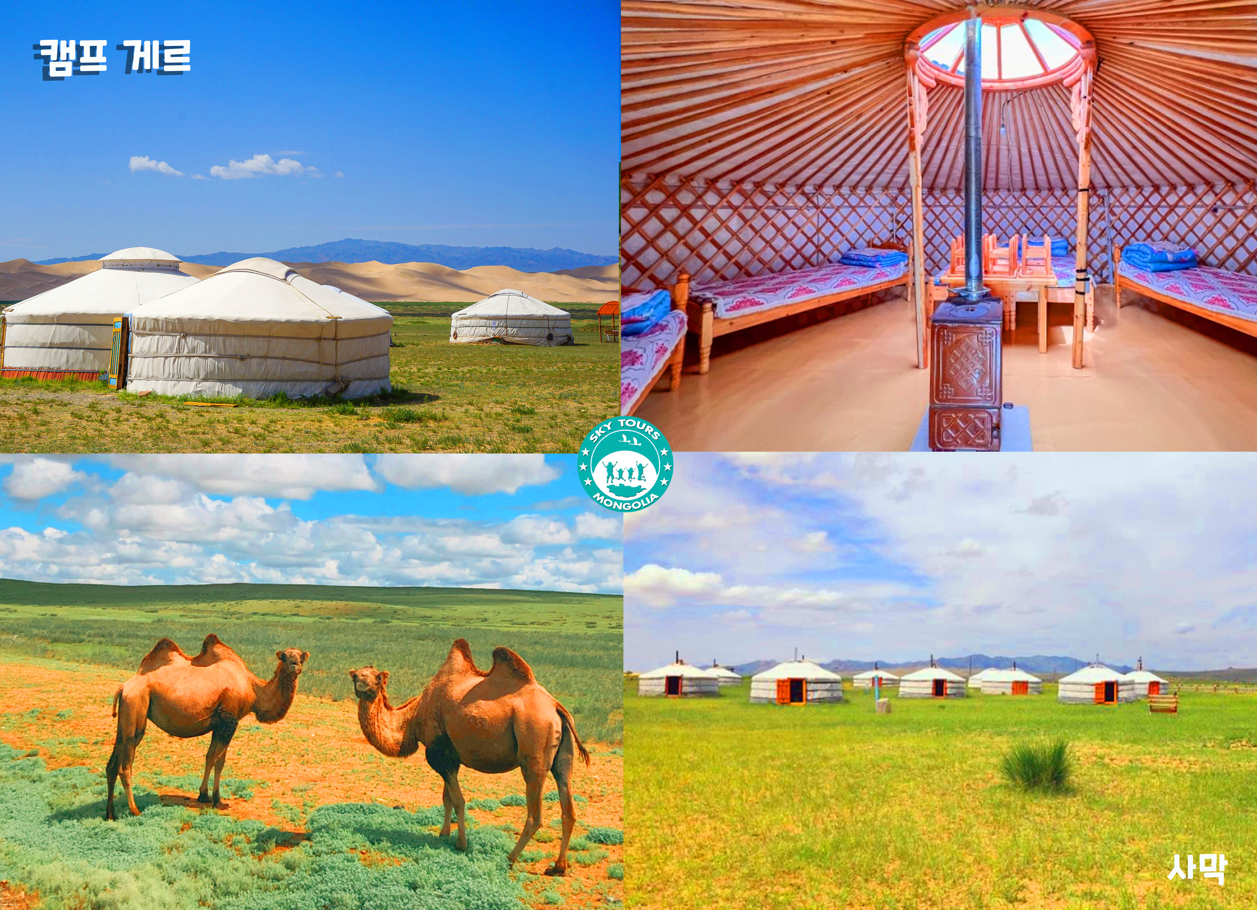 [1일차] 울란바토르–미니사막 이동 (4시간 소요) 공항 아니면 여행자들이 투숙한 숙소에서 픽업하여 엘셍 타사르하이를 향해 이동합니다. 공항에서 투어시작할 경우 : 여행자님들의 비행시간에 맞춰서 시작합니다. (이동거리 : 280km / 이동 시간: 4시간) 미니사막에서 낚타를 타고, 석양을 바라보면서 사막 트레킹을 하며 몽골의 사막을 즐겨보세요. 엘승 타사르해(Elsen Tasarhai)의 뜻은 ‘분절된 모래’ 라고 할 수 있다. 고비 사막의 ‘홍고링 엘스’와 모양이 비슷하게 생겼는데 모래 언덕은 훨씬 작다. 그래서 ‘미니 고비사막’ 이라고도 불린다. 그래도 가로 5km, 세로 80km 정도의 규모로 모래 사막이 분포한다. 분포는 넓게 하지만 모래 사구가 작게 부분 부분 나뉘어서 분포한다. 그래서 엘승 타사르해 라고 하여 ‘분절된 모래’ 라는 이름이 붙여진 듯 하다. 수도 울란바토르에서 포장 도로로 가깝게 올 수 있고, 좀 더 북쪽으로 도로에서 들어가면 모래 사막이 넓게 분포한다. 엘승 타사르해는 주변의 초원과 서로 뒤섞여 있는 모습인데, 남부 지방의 고비사막은 오래전부터 사막 지형이었으나 이 곳은 중부지방으로 예전보다 사막지형이 점점 넓어 지고 있어 초원을 계속 모래 사막이 넓혀 가고 있다. [1 일차]낙타 트레킹 (1시간 소요) 당연히 낙타 트레킹은 기본이겠죠 ^^ 쌍봉낙타(雙峯駱駝, 학명: Camelus bactrianus) 또는 박트리아낙타(영어: Bactrian Camel)는 북동아시아의 초원에 서식하는 낙타의 한 갈래이다. 이름과 같이 쌍봉낙타는 단봉낙타와 달리 두개의 혹이 있다. 단봉낙타보다 튼튼하며 사지는 굵고 짧다. 육봉의 혹이 두 개이며 털은 길고 뻑뻑하다. 발바닥은 단단하여 바위나 자갈이 많은 구릉지에 적합하다. 옛날부터 몽골·고비 사막·중국 등지에서 사육되었으며 반야생상태의 것도 있다. 새끼는 날 때부터 눈을 뜨고, 몸은 양털 같은 털로 덮여 있다. 태어난 지 몇 시간이 지나면 달릴 수 있고, 새끼와 어미는 떼어 놓지 않는 한 몇 년이고 함께 지낸다. ▶ 선택 관광 : 엘승타사르해에서 낙타 체험, 야외 삼겹살 체험 ★주의★: 낙타를 탈 때 강렬한 색상의 옷이나 바람에 의해 소리가 심하게 나는 옷은 자제하고 밑창이 거친 신발은 신지 않는 것이 좋다.낙타에게 접근할 때는 차분하게 말의 좌측이나 앞부분으로 다가가야 한다. ★낙타체험을 원하지 않으시는 분은 야외에서 자유 여행 가능합니다. ★낙타체험 안전 교육 제공 (승마 체험 전 약 10분간 전문가의 설명이 교욕을 받으셔야합니다.) [1일차] 샌드 보딩 (1시간 소요) 거대한 모래 언덕 샌드보딩 체험을 즐길수 있습니다. [1 일차] 호르호그 체험 (1시간 소요) 호르호그(몽골어: хорхог, ᠬᠣ᠊᠊ᠷᠠᠠᠣ᠊᠊ᠬ)는 몽골의 전통적인 요리입니다. 명절이나 집안에 경사가 있을 때 먹거나 귀한 손님에게 대접하는 음식이다. 물이 든 철통에 뜨겁게 달군 돌을 넣고 그 위에 먹기 좋게 자른 양고기와 달군 돌을 번갈아 올린 뒤 양파 등 채소와 소금을 넣고 뚜껑을 닫은 다음 김이 새지 않게 봉해 난로에서 두 시간 정도 푹 찐다. 불에 구운 것 같으면서도 훈제한 듯한 양고기 냄새! 주먹만 한 고기를 하나 집어들고 뜯어먹는데, 감탄이 절로 나온다. ‘양고기가 이렇게 맛있는 거구나’고 느끼게 한 양고기의 재발견. 누리고 느끼한 맛이 전혀 없는, 유목민 최고의 손맛! 주인네가 권하지 않아도 저절로 손이 간다. 시간과 정성이 깃든 만큼 호르혹 요리의 맛은 그야말로 몽골 음식 최고의 맛이다. 몽골을 다녀간 외국인에게 가장 맛있었던 몽골 음식을 꼽으라고 하면, 십중팔구 호르혹이라고 말할 정도이다. 몽골의 유목민 또한 명절이 아닌 이상 가장 귀한 손님에게만 호르혹 요리를 대접한다. 호르혹을 배불리 먹고 수테차로 입가심을 하고 나니, 행복하다.