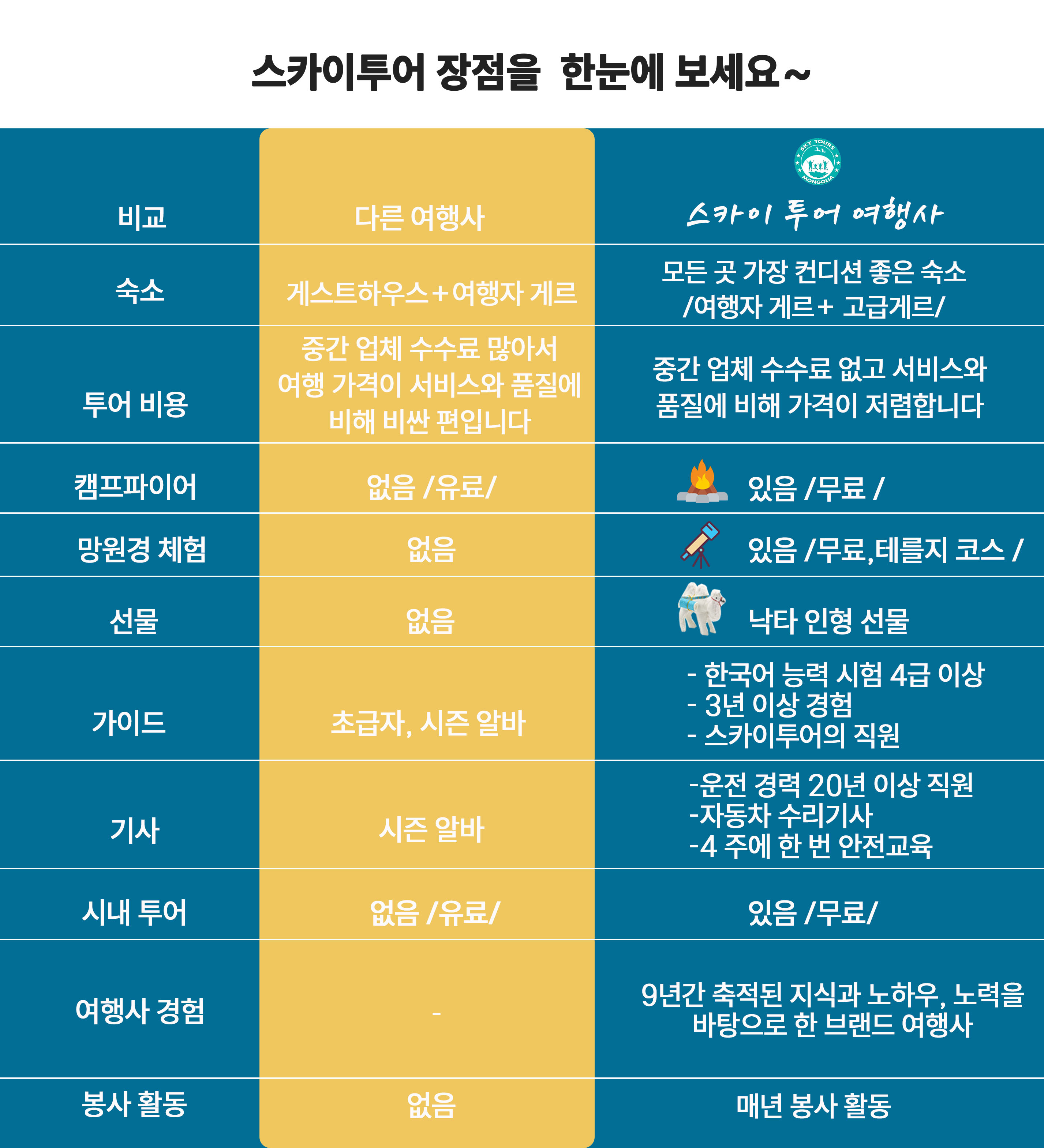 🤍4박5일 몽골 고비사막, 쳉헤르 온천과 테를지 여행입니다. 중앙몽골 자연의 아름다움을 느껴 보세요! 본 상품은 한국인들의 가장 좋아하는 여행상품들 중 하나입니다. • 액티비티/망원경 체험 , 낙타, 승마, 온천 체험, 아르아발 사원, 샌딩 보딩, 거북이 바위, 독수리 체험, 칭기스칸 동상,몽골 전통적인 음식 호르혹, 야외 삼겹살, 게르 체험, 아름다운 별 감상, 은하수와 푸른 초원과 함께 아름다운 몽골 여행입니다./ ‘미니고비’, ‘미니사막’으 라고 불리는 엘승타사르해는 몽골의 수도 울란바토르에서 서쪽으로 350~400km의 거리에 위치해 있습니다. 몽골전통가옥 게르(GER)를 체험하고, 미니사막에서 일몰을 감상하며 모래썰매를 타고, 낙타체험도 즐길 수 있는 일정입니다. 쳉헤르 온천은 초원 한가운데에서 밤하늘의 별이 쏟아지는 야외 온천(노천온천)을 즐기는 투어입니다. 온천의 수원지는 산에서 내려오며 각종 피부에 좋은 자연 미네랄 워터로 피부병, 피부미용에 좋으며 당뇨병, 치료후에 건강 회복, 피로, 소화 등에 효과가 있습니다. 초원의 야생동물, 끝없는 지평선 그림 같은 하늘, 밤하늘의 별을 보며 온천을 즐길 수 있습니다. 테렐지국립공원은 울란바토르에서 북쪽으로 70 km 거리에 위치하고 있습니다. 면적은 300 ha정도, 초원, 기암괴석 그리고 숲으로 이루어진 곳으로 자연 상태가 비교적 잘 유지되고 있고 수도인 울란바토르에서 가까운 국립공원으로 많은 사람들이 찾는 관광지입니다. 1-6인 여행경우는 스타렉스, 푸로공, 승용차 6-48인 여행경우는 버스, 스타렉스, 푸로공 [📌투어일정] - 1일 차 * 미니 사막 /체험: 낙타 체험, 샌딩 보딩, 야외 삼겹살/ -2 일 차 * 쳉헤르 온천 /체험: 온천 체험, 인생 샷 / - 3 일 차 * 테를지 국립 공원 / 체험: 아르아발 사원, 거북이 바위, 망원경체험/ - 4 일 차 * 테를지 국립공원 및 칭기스칸 동상 / 체험: 칭기스칸 동상, 독수리 체험, 승마/ - 5 일 차 * 울란바토르 시내 여행 / 국립백화점, 캐시미어 아울렛, 칭기스칸 방물관, 칭기스칸 광장 구경/