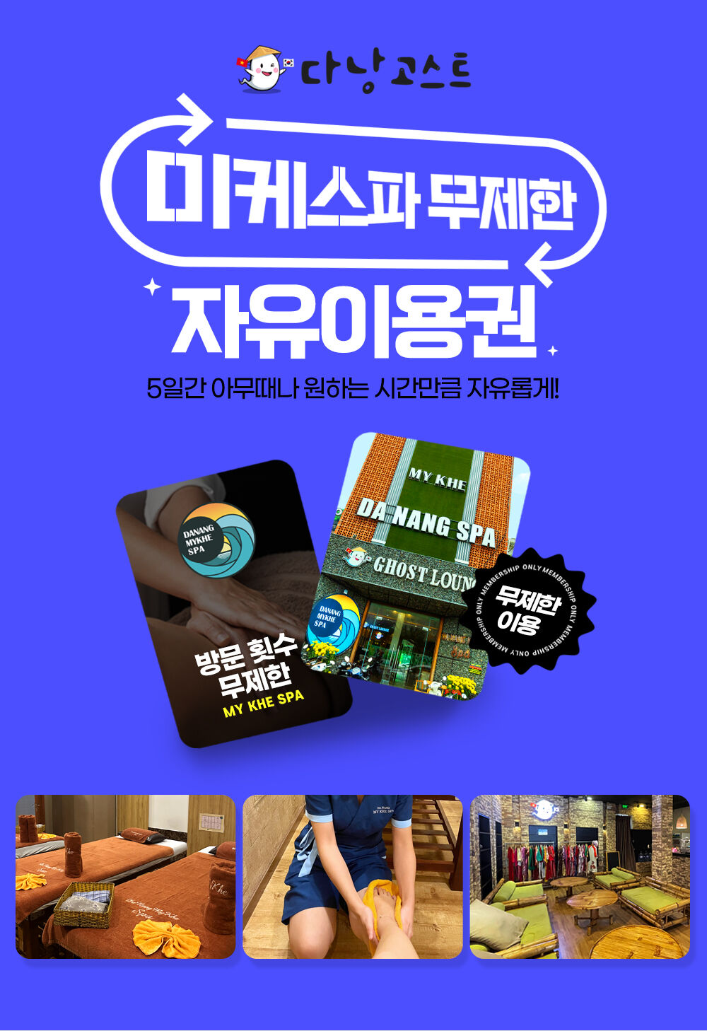 - 구매 후 사전 예약 - 다낭의 인기 마사지 샵 미케스파를 5일간 무제한으로 이용할 수 있는 자유이용권을 소개해 드려요. 다낭의 유명 관광지에 인접해 접근성이 높은 미케스파는 고급 마사지와 친절한 서비스로 많은 사랑을 받고 있는 곳이에요. 하루 일과를 시작하기 전에 방문하고, 일정이 끝난 후 피로를 풀기 위해 방문해도 추가 비용 없이 무제한으로 즐길 수 있어요. 합리적인 가격의 방문 횟수&마사지 시간 무제한 자유이용권으로 다낭 마사지 고민을 한 번에 해결해 보세요! 1. 키즈 마사지 (60분 / 90분) 아이들에게 특화된 프로그램으로, 성장통을 이완시키고 성장을 촉진하는 효과가 있는 마사지에요. 2. 풋스파 (60분 / 90분) 허벅지, 종아리, 발로 이어지는 부위를 부드럽게 풀어드려요. 3. 아로마 마사지 (60분 / 90분 / 120분) 가장 기본이 되는 마사지로, 베트남 전통 지압 마사지에요. 4. 핫스톤 마사지 (90분 / 120분) 아로마 마사지와 동일한 프로그램이지만 등, 허리, 어깨, 골반에 지압 마사지 전 따뜻한 돌로 근육을 이완시켜 드려요. 5. 드라이 마사지 (60분 / 90분) 스트레칭과 깊은 마사지를 포함하는 타이 마사지에요. 6. 포핸드 마사지 (60분 / 90분) 두 명의 마사지사가 합을 맞춰 진행하는 황제 마사지에요. 7. 임산부 마사지 (60분 / 90분 / 120분) 임신 중의 불편함과 통증을 완화하고 전반적인 건강을 증진하기 위해 특별히 설계된 마사지로 안심하고 받으실 수 있어요.