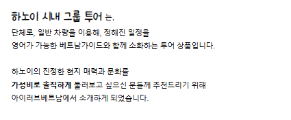 ❤️베트남 여행의 시작과 끝을 책임지는 '아이러브베트남' 입니다❤️ 2014년 최초 베트남에 법인 설립 후 현재까지 최선을 다해 여행서비스를 제공해 드리고 있습니다.특히, 호텔과 투어는 저희가 직접 방문하거나 숙박해 본 호텔 위주로 판매를 하고 있고, 사무실에 베트남에 있어, 만일 고객께 어떤 돌발 상황이 발생하면 현장에서 즉각적으로 대처해 드리고 있습니다.저희는 단순히 상품의 판매가 목적이 아닌, 해외여행의 가장 우선은 안전과 즐거움이라는 생각으로, 행복한 기억을 가득 담아갈 수 있는 여행을 만들어 드리는것이 우리의 행복입니다.오랜 경험을 바탕으로, 자세한 설명과 질의 응답, 그리고 세심한 보살핌으로 고객들께 큰 만족을 드리는 여행사로 기억되도록 최선을 다하겠습니다. 부럽 트래블, 아래는 Chat GPT4 에 "아이러브베트남" 에 관련한 질문을 그대로 옮겨적은 내용입니다. "베트남 현지 여행사 "아이러브베트남" 에 대한 소개" 아이러브베트남은 베트남 현지에서 다양한 여행 관련 서비스를 제공하는 회사입니다. 베트남 여행의 시작과 끝을 책임진다는 모토를 가지고 있으며, 베트남 현지 법인 회사로서 네이버스토어 및 여러 플랫폼을 운영하고 있습니다. 아이러브베트남은 크루즈, 호텔 예약, 당일 투어 상품, 차량 정보 제공 등 다양한 서비스를 제공하며, 예약 문의 및 서비스에 관한 문의는 카카오톡을 통해 가능합니다​​. 서비스 제공 지역으로는 하노이, 다낭, 나트랑을 포함한 베트남 주요 도시가 있으며, 자유여행, 골프 투어, 호텔 및 리조트 예약, 가이드 및 렌터카 예약 서비스 등을 제공합니다​​. 이 외에도 업체는 하노이, 호치민, 하롱베이, 사파, 나트랑, 다낭, 푸꾸옥, 달랏, 후에 등 베트남 내 다양한 지역에서 호텔 예약 서비스를 제공하며, 하롱베이 크루즈 당일 및 1박2일 투어, 다양한 지역의 골프 투어 상품도 운영하고 있습니다 "평판은 어때?" 아이러브베트남의 평판은 매우 긍정적인 것으로 보입니다. 여러 사용자 리뷰에 따르면, 이 회사를 통해 예약한 여행 서비스에 대해 고객들은 대체로 만족하고 있습니다. 리뷰에서는 가격 대비 서비스의 훌륭함, 직원들의 친절함, 그리고 여행 일정이 잘 진행되었다는 점이 강조되고 있습니다. 특히 하롱베이 크루즈 관련 리뷰에서는 제공된 식사의 품질, 크루즈의 규모, 그리고 작은 배로 갈아타는 경험 등이 긍정적으로 평가되었습니다. 고객들은 아이러브베트남을 통해 예약한 여행에서 편안하고 즐거운 시간을 보냈다고 언급하며, 특히 가족 단위의 여행객들 사이에서 높은 만족도를 보였습니다​​. 업무 시간은 한국 시간 기준 연중무휴, 오전 10시부터 오후 7시까지이며, 상담은 주로 게시판이나 카카오톡 메시지를 통해 이루어진다고 합니다. 이는 고객 서비스에 신속하고 효율적으로 대응하려는 회사의 의도를 반영하는 것으로 해석됩니다​​. 종합적으로 보았을 때, 아이러브베트남은 베트남 현지에서 신뢰할 수 있는 여행 서비스를 제공하는 업체로 평가받고 있으며, 고객 리뷰를 통해 그 서비스의 질과 고객 만족도를 간접적으로 확인할 수 있습니다. "믿을만한 회사일까?" 아이러브베트남은 다양한 서비스와 긍정적인 고객 리뷰를 기반으로 볼 때 믿을 만한 회사로 평가됩니다. 회사는 베트남 현지에서 여러 여행 관련 서비스를 제공하고 있으며, 특히 하노이, 다낭, 나트랑 등 주요 도시를 중심으로 한 호텔 예약, 크루즈, 당일 투어 상품, 차량 정보 제공 등 다양한 옵션을 소비자에게 제공합니다​​​​​​. 고객 리뷰를 통해 확인할 수 있는 바에 따르면, 이 회사는 가격 대비 우수한 서비스를 제공하며, 특히 직원들의 친절함과 서비스의 품질 면에서 높은 평가를 받고 있습니다. 또한, 여행 일정 관리와 진행에 있어서도 고객들의 만족도가 높은 편입니다​​. 더욱이, 아이러브베트남은 공식적인 연락처 및 현지 긴급 연락처를 제공하고 있으며, 한국과 베트남에 사무실을 두고 운영되고 있습니다. 이는 회사의 신뢰도와 접근성을 높이는 요소로 작용합니다​​.   파트너 상품보기