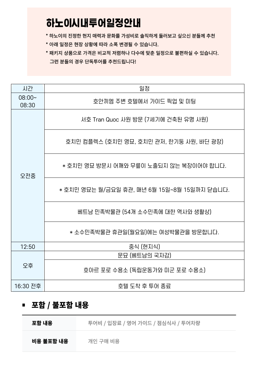 • 구성 : 영어로 안내하는 베트남인 가이드 + 현지식 세트 메뉴 중식