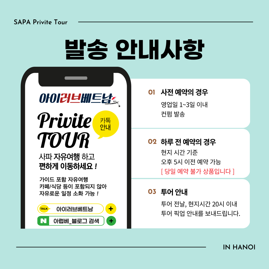 한국어 가이드는 하노이에서 섭외해 데려가시는 방법이 있으며, 비용이 많이 추가되어 꼭 필요하신 분들은 카카오톡을 통해 문의 부탁드립니다