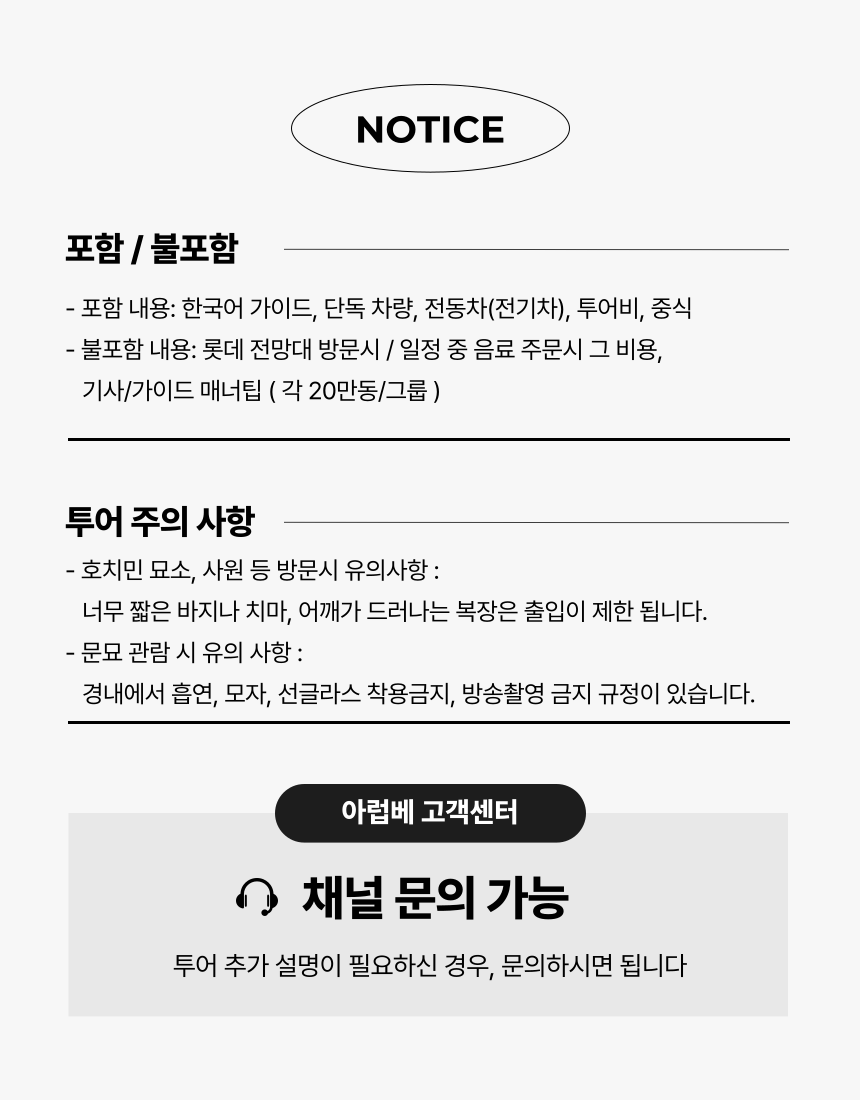 • 불포함 : 롯데 전망대 방문 시/일정 중 음료 주문 시 그 비용, 기사/가이드 매너팁(각 20만동/그룹)