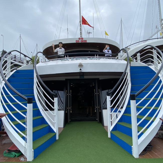픽업 차량: 7인승 리무진 / 15인승 리무진 픽업 시간: 오전 7시 전후 픽업 차량은 7인승 리무진 / 15인승 리무진등 리무진급 차량이 배정됩니다. 크루즈에서 생수도 사 드셔야 하므로(2만동) 기본적인 물이나 간식을 미리 준비 하시면 좋습니다. 차 안에서 혹은 하롱베이 도착 후 간단히 드실 간식을 준비 하시면 좋습니다. 하롱베이 뚜언 초우 항구의 체크인 라운지 입니다. 두 대의 보트가 인원에 따라 운영됩니다. 오전 10시 30분경, 탑승이 시작됩니다.
