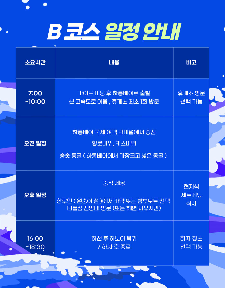 • ⏱  투어소요시간 : 천궁바항코스/약 4시간 , 하롱베이3대명소/약 6 시간 ( 유동적 변경 )