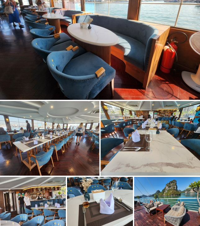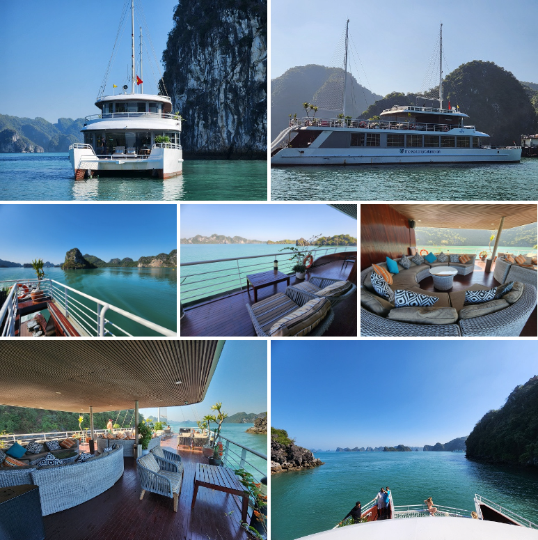 크루즈 선체 크기가 큰 보트는 아니지만 일반(통통배) 보트보다 외관이 깔끔해 예쁩니다. 특징으로는 선수쪽에 그물로 된 선베드가 있습니다. 돌출되어있는 선수&그물 베드 에서 바라보는 하롱베이 풍경이 끝내줍니다.