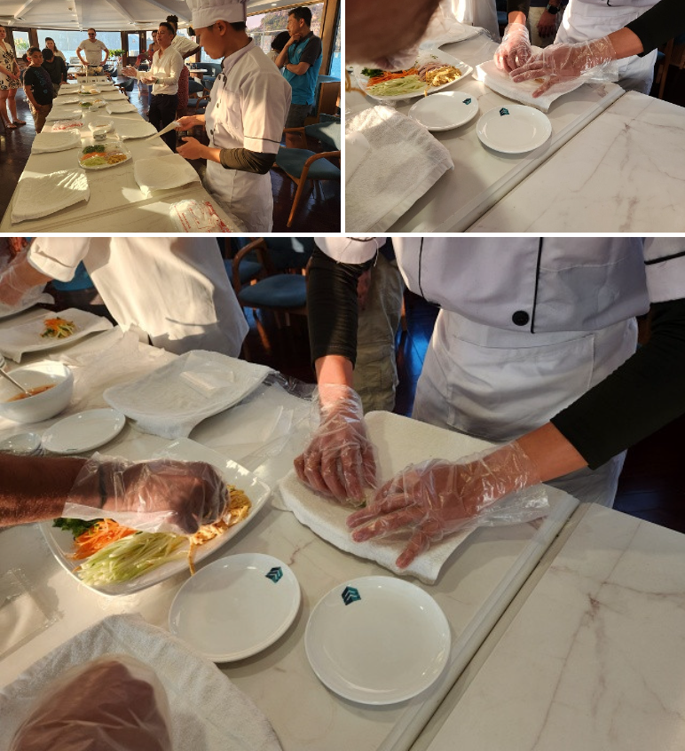 액티비티 후 크루즈로 복귀해, 잠시 휴식시간을 가진 뒤 쿠킹 클래스가 진행됩니다. 요리를 못해도 따라할수 있게 요리사님이 시연도 보여주시고 도와주십니다. 그러면서 베트남 전통 음식인 넴을 만들어서 먹어보는 시간을 가집니다.