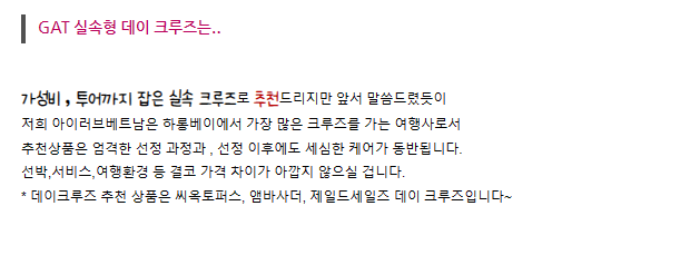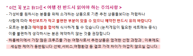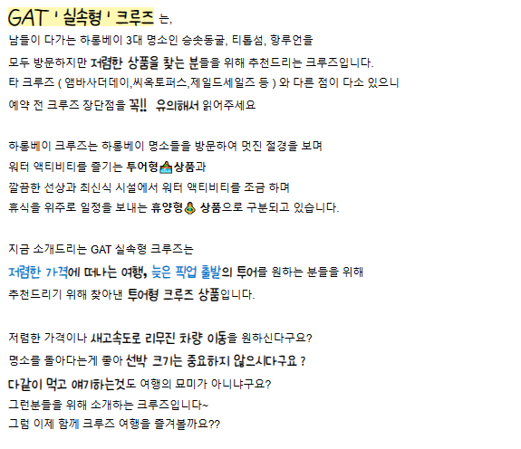 이렇게 상품에 대한 간단한 설명을 드렸구요. 저희 아이러브베트남에서는 정확한 정보 전달을 위해 당연히!!! 해당 크루즈를 직접 방문하고 있습니다 ! 주의 ! 저희처럼 상세한 설명이 없다면 직접 다녀오지 않고 판매하는 경우가 많으니 주의하세요 그럼 여행 일정을 세세히 살펴보도록 하겠습니다~ 레츠 고우!!!👉👉 * 지금부터 이하 내용들은, 당일 크루즈 현장 상황에 따라 예고 없이 변경될 수 있습니다.