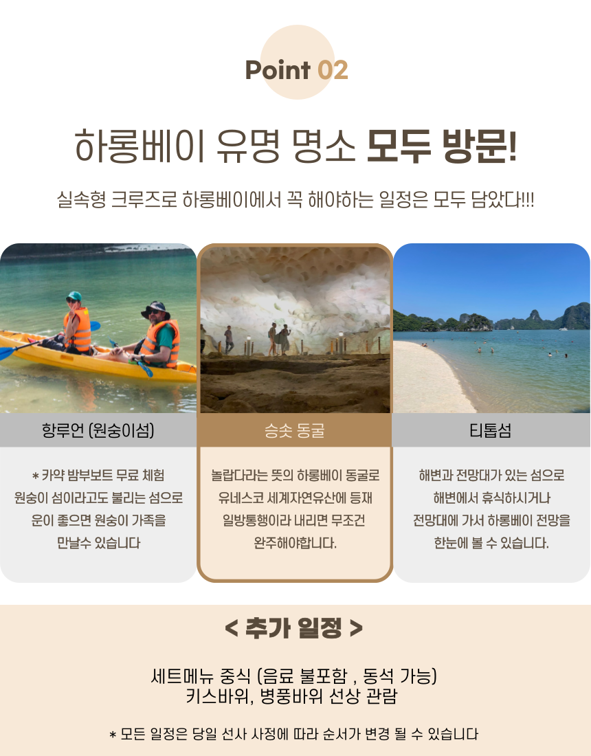 승솟동굴, 티톱섬, 항 루언등 하롱베이의 유명 3대 관광명소를 모두 방문 원하시는 분