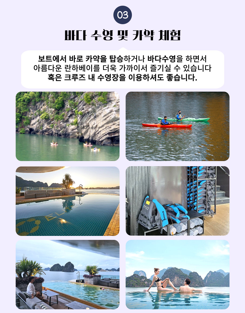 - 크루즈 일정 중, 카약과 밤부보트를 모두 탑승 가능하다는 점
