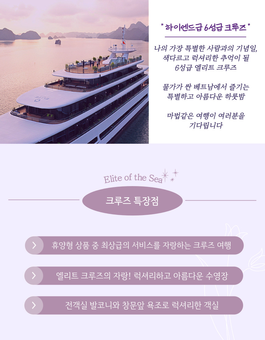 [하롱베이] 6성급 엘리트 1박2일 크루즈 #픽업샌딩 #휴양형