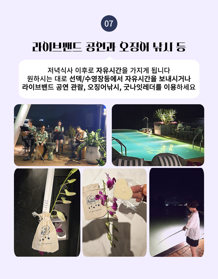 - 드론을 이용한 사진 촬영등 타 크루즈에 비해 값어치 있는 서비스가 제공되는것이 특징 입니다.
