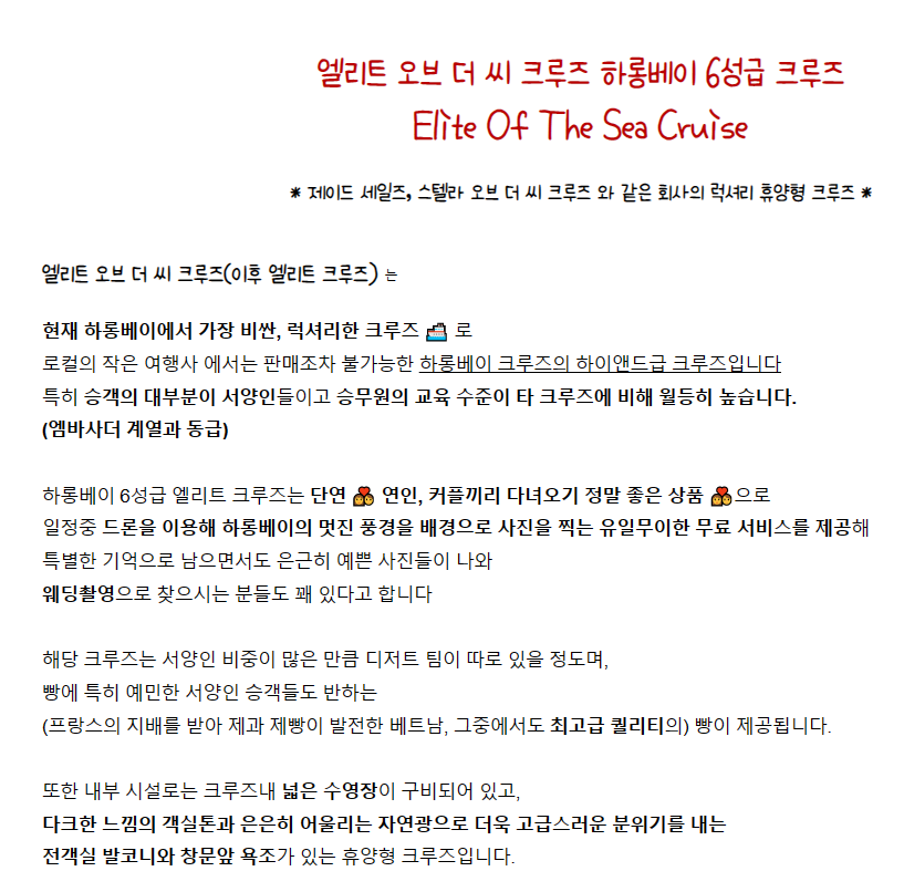 ❤️베트남 여행의 시작과 끝을 책임지는 '아이러브베트남' 입니다❤️ 2014년 최초 베트남에 법인 설립 후 현재까지 최선을 다해 여행서비스를 제공해 드리고 있습니다.특히, 호텔과 투어는 저희가 직접 방문하거나 숙박해 본 호텔 위주로 판매를 하고 있고, 사무실에 베트남에 있어, 만일 고객께 어떤 돌발 상황이 발생하면 현장에서 즉각적으로 대처해 드리고 있습니다.저희는 단순히 상품의 판매가 목적이 아닌, 해외여행의 가장 우선은 안전과 즐거움이라는 생각으로, 행복한 기억을 가득 담아갈 수 있는 여행을 만들어 드리는것이 우리의 행복입니다.오랜 경험을 바탕으로, 자세한 설명과 질의 응답, 그리고 세심한 보살핌으로 고객들께 큰 만족을 드리는 여행사로 기억되도록 최선을 다하겠습니다. 부럽 트래블, 아래는 Chat GPT4 에 "아이러브베트남" 에 관련한 질문을 그대로 옮겨적은 내용입니다. "베트남 현지 여행사 "아이러브베트남" 에 대한 소개" 아이러브베트남은 베트남 현지에서 다양한 여행 관련 서비스를 제공하는 회사입니다. 베트남 여행의 시작과 끝을 책임진다는 모토를 가지고 있으며, 베트남 현지 법인 회사로서 네이버스토어 및 여러 플랫폼을 운영하고 있습니다. 아이러브베트남은 크루즈, 호텔 예약, 당일 투어 상품, 차량 정보 제공 등 다양한 서비스를 제공하며, 예약 문의 및 서비스에 관한 문의는 카카오톡을 통해 가능합니다​​. 서비스 제공 지역으로는 하노이, 다낭, 나트랑을 포함한 베트남 주요 도시가 있으며, 자유여행, 골프 투어, 호텔 및 리조트 예약, 가이드 및 렌터카 예약 서비스 등을 제공합니다​​. 이 외에도 업체는 하노이, 호치민, 하롱베이, 사파, 나트랑, 다낭, 푸꾸옥, 달랏, 후에 등 베트남 내 다양한 지역에서 호텔 예약 서비스를 제공하며, 하롱베이 크루즈 당일 및 1박2일 투어, 다양한 지역의 골프 투어 상품도 운영하고 있습니다 "평판은 어때?" 아이러브베트남의 평판은 매우 긍정적인 것으로 보입니다. 여러 사용자 리뷰에 따르면, 이 회사를 통해 예약한 여행 서비스에 대해 고객들은 대체로 만족하고 있습니다. 리뷰에서는 가격 대비 서비스의 훌륭함, 직원들의 친절함, 그리고 여행 일정이 잘 진행되었다는 점이 강조되고 있습니다. 특히 하롱베이 크루즈 관련 리뷰에서는 제공된 식사의 품질, 크루즈의 규모, 그리고 작은 배로 갈아타는 경험 등이 긍정적으로 평가되었습니다. 고객들은 아이러브베트남을 통해 예약한 여행에서 편안하고 즐거운 시간을 보냈다고 언급하며, 특히 가족 단위의 여행객들 사이에서 높은 만족도를 보였습니다​​. 업무 시간은 한국 시간 기준 연중무휴, 오전 10시부터 오후 7시까지이며, 상담은 주로 게시판이나 카카오톡 메시지를 통해 이루어진다고 합니다. 이는 고객 서비스에 신속하고 효율적으로 대응하려는 회사의 의도를 반영하는 것으로 해석됩니다​​. 종합적으로 보았을 때, 아이러브베트남은 베트남 현지에서 신뢰할 수 있는 여행 서비스를 제공하는 업체로 평가받고 있으며, 고객 리뷰를 통해 그 서비스의 질과 고객 만족도를 간접적으로 확인할 수 있습니다. "믿을만한 회사일까?" 아이러브베트남은 다양한 서비스와 긍정적인 고객 리뷰를 기반으로 볼 때 믿을 만한 회사로 평가됩니다. 회사는 베트남 현지에서 여러 여행 관련 서비스를 제공하고 있으며, 특히 하노이, 다낭, 나트랑 등 주요 도시를 중심으로 한 호텔 예약, 크루즈, 당일 투어 상품, 차량 정보 제공 등 다양한 옵션을 소비자에게 제공합니다​​​​​​. 고객 리뷰를 통해 확인할 수 있는 바에 따르면, 이 회사는 가격 대비 우수한 서비스를 제공하며, 특히 직원들의 친절함과 서비스의 품질 면에서 높은 평가를 받고 있습니다. 또한, 여행 일정 관리와 진행에 있어서도 고객들의 만족도가 높은 편입니다​​. 더욱이, 아이러브베트남은 공식적인 연락처 및 현지 긴급 연락처를 제공하고 있으며, 한국과 베트남에 사무실을 두고 운영되고 있습니다. 이는 회사의 신뢰도와 접근성을 높이는 요소로 작용합니다​​.   파트너 상품보기