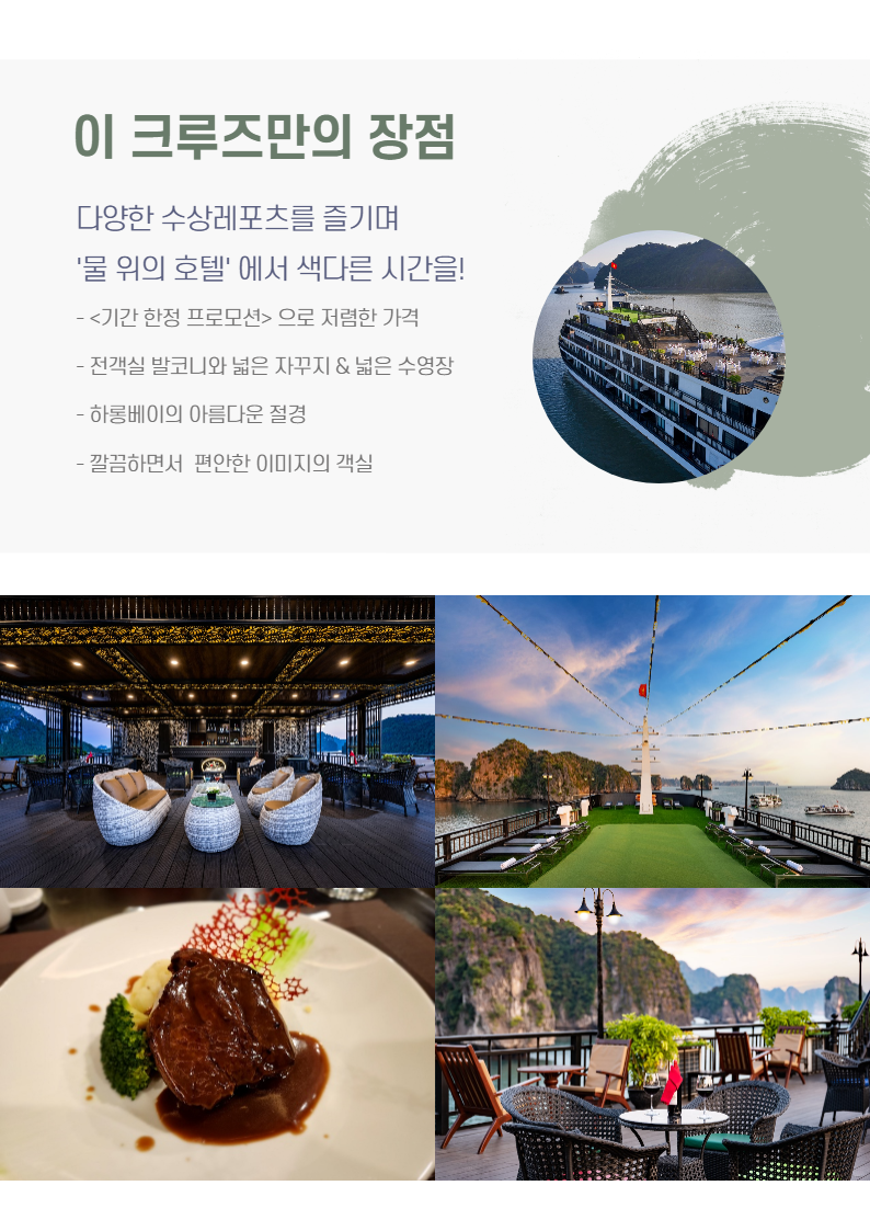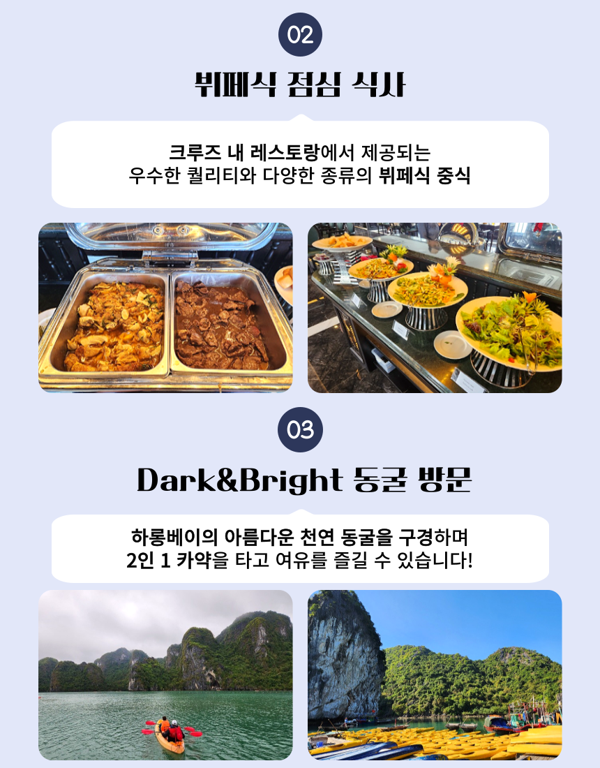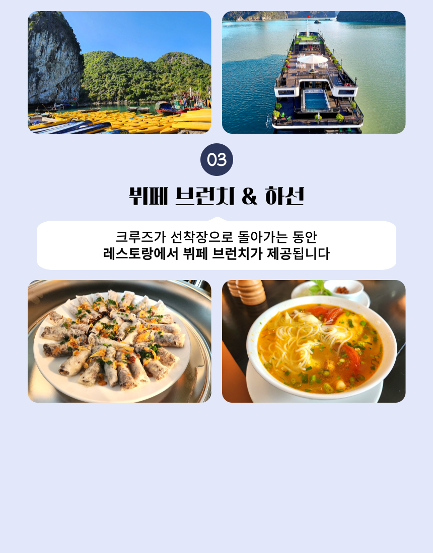 • 카약과 밤부보트를 모두 체험할 수 있는 일정의 크루즈로 다양한 수상레포츠를 즐기며 물위의 호텔에서 색다른 시간을 보내보세요