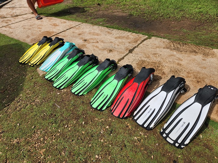 오리발, 스쿠버 다이빙 수트, 공기통 등 모두 준비되어 있습니다.
