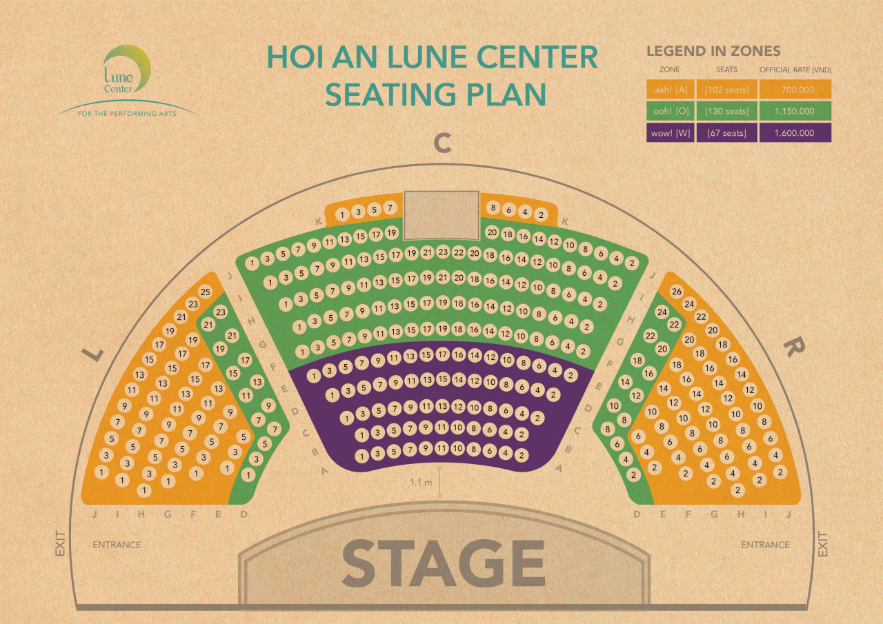 - Wow! 구역 (극장 중앙의 최상의 뷰) 베트남 부족의 삶을 곡예와 현대 무용으로 표현하는 테달쇼를 보라색 구역 "Wow!" 좌석에서 관람하실 수 있습니다. * 보라색 구역은 극장에서 뷰가 가장 좋은 중앙 위치에 있습니다. - Ooh! 구역 (극장의 중앙 부분에 위치) 베트남 부족의 삶을 곡예와 현대 무용으로 표현하는 테달쇼를 녹색 구역 "Ooh!" 좌석에서 관람하실 수 있습니다. * 녹색 구역은 극장의 중앙 부분에 위치하고 있습니다. - Aah! 구역 (극장의 오른쪽과 왼쪽 사이드에 위치) 베트남 부족의 삶을 곡예와 현대 무용으로 표현하는 테달쇼를 노란색 구역 "Aah!" 좌석에서 관람하실 수 있습니다. *노란색 구역은 극장의 오른쪽과 왼쪽 사이드에 위치하고 있습니다.