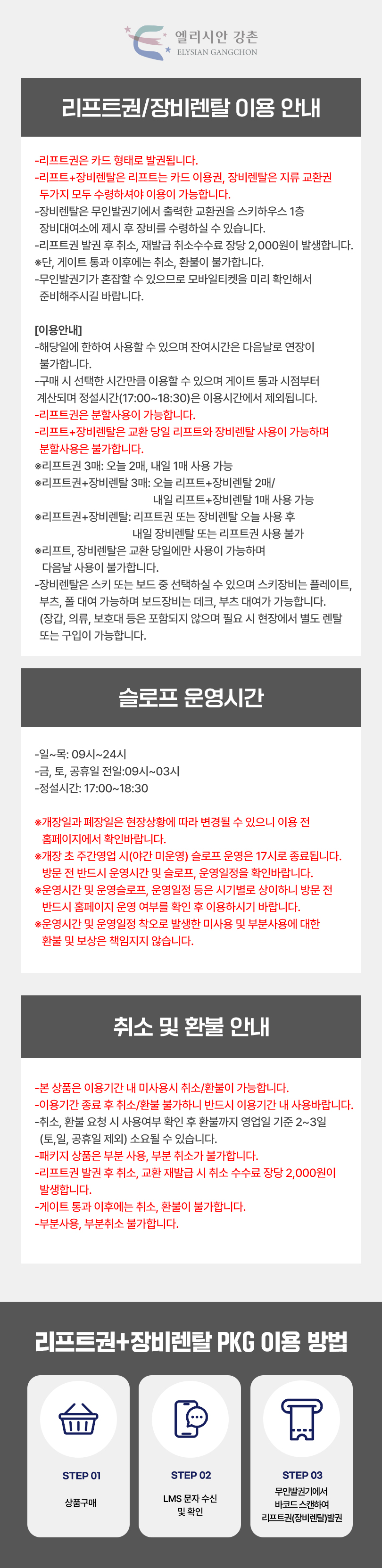 리프트 + 장비렌탈 상품은 리프트 카드 이용권과 장비렌탈 지류 교환권 두 가지 모두 수령해야 이용 가능합니다.