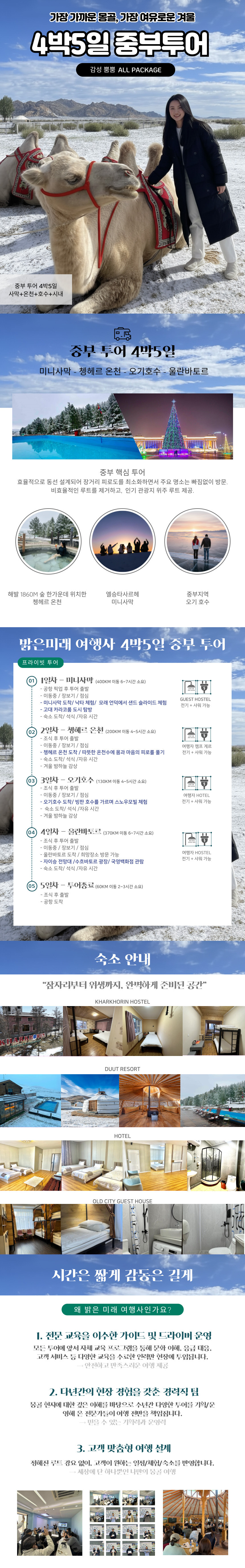 • 몽골 여행 전 국내(대한민국)에서 “여행자 보험” 가입을 권장합니다. (※ 본 상품은 여행자 보험 불포함)