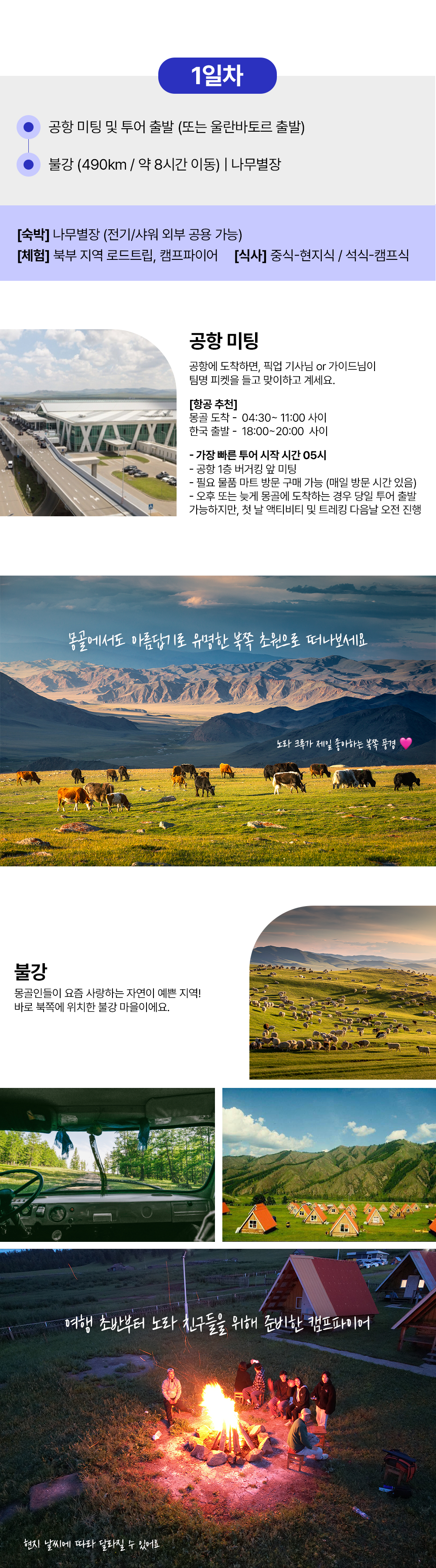 • 예기치 못한 차량 고장 발생 시 여행사는 즉시 대체 차량을 지원하나, 몽골의 장거리 특성상 도착까지 시간이 소요될 수 있습니다. 이로 인한 목적지 도착 지연 및 일정 미소화에 대한 환불은 어렵습니다.
