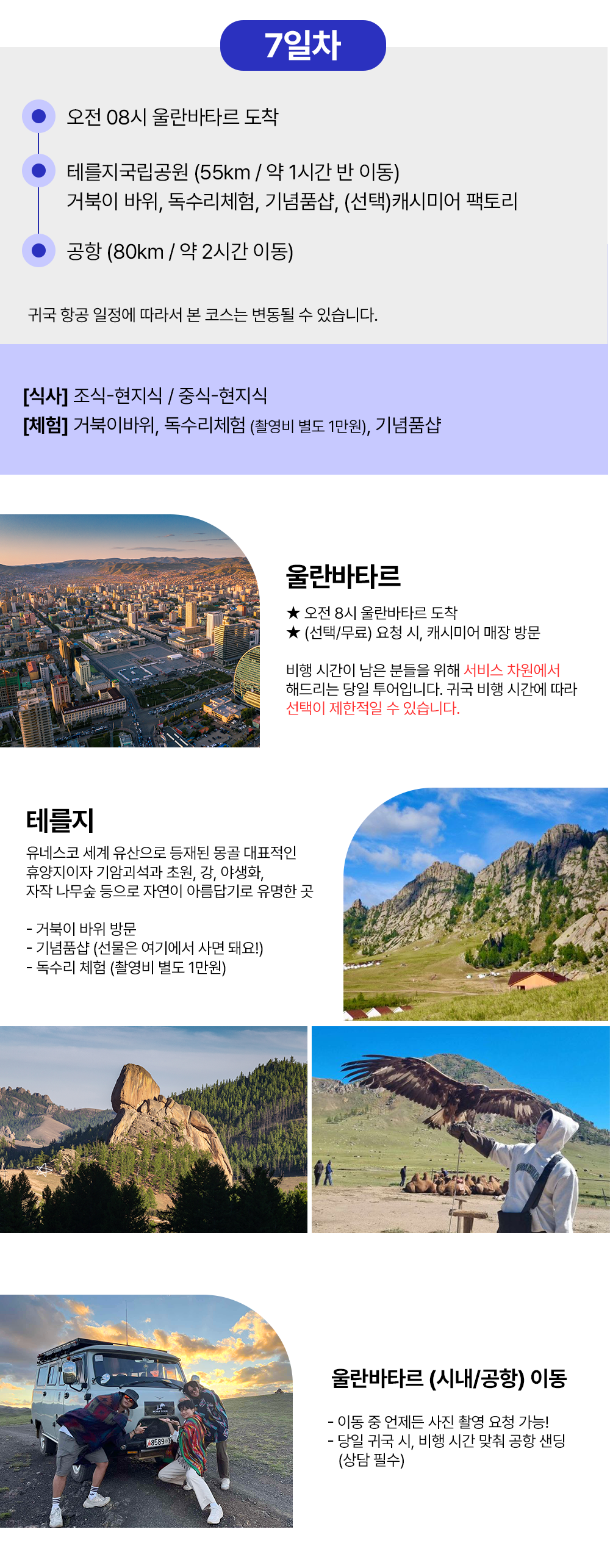 • [7day] 테를지 국립공원의 명소인 거북이 바위독수리 체험, 기념품 샵캐시미어 팩토리까지 둘러본 후 모든 여정을 마무리하며 공항 샌딩으로 편안하게 이동합니다.
