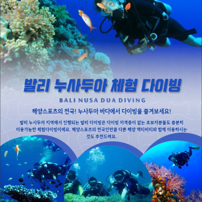 발리 누사두아 지역에서 진행되는 발리 다이빙은 다이빙 자격증이 없는 초보자분들도 충분히 이용 가능한 체험다이빙이에요. 해양스포츠의 천국인만큼 다른 해양 액티비티와 함께 이용하시는 것도 추천드려요