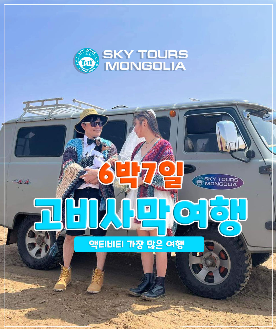 [투어 소개] 6박 7일 몽골 고비사막과 테를지 여행입니다. • 액티비티/망원경 체험 , 낙타, 승마, 아르아발 사원, 모래 썰매, 거북이 바위, 독수리 체험, 칭기스칸 동상, 몽골 전통적인 음식 호르혹, 야외 삼겹살, 게르 체험, 아름다운 별 감상, 은하수와 푸른 초원과 함께 아름다운 몽골 여행입니다. [투어 코스] Day 1 : 바가가자르링 촐로 /야외 삼겹살/ Day 2 : 욜링암 /승마 체험/ Day 3 : 홍고린엘스 / 낙타 트래킹, 샌딩 보드 체험, 전통 호르혹/ Day 4 : 바양자그 /아름다운 별 감상/ Day 5 : 차강소브라그 /트레이킹 Day 6 : 테를지 (칭기스칸 동상, 독수리 체험, 아르야발 사원, 거북이 바위 구경, 망원경 체험) Day 7 : 공항 및 숙소/ 케시미어 알렛 구경, 자이상 타워 구경/