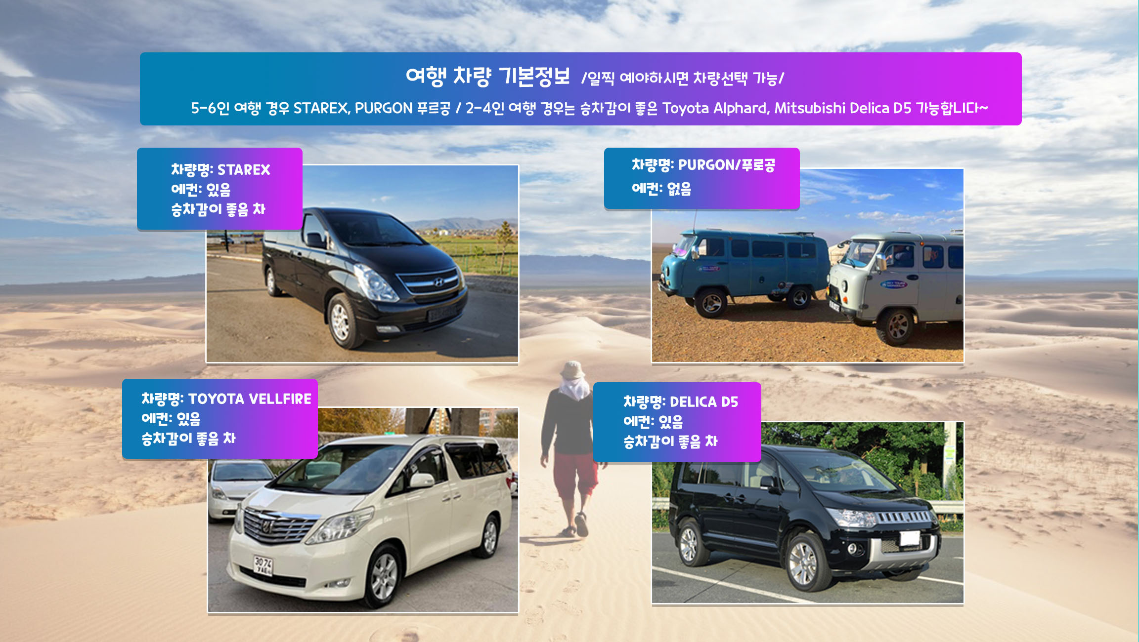 • 전 일정 차량과 한국어 가이드 • 전 일정 숙소 및 식사 • 일정표상 입장료 및 도로비 • 1일차 차강솝라가 야외 삼겹살 • 3일차 홍고린엘스 낙타 트레킹 1회 / 1시간 • 3일차 홍고린엘스 모래 썰매, 전통 음식인 호르혹 • 4일차 욜린암 승마 트레킹 1회 / 1시간 • 6일차 테를지 (망원경체험, 칭기스칸 동상, 독수리 체험, 아르야발 사원, 거북이 바위 구경, 망원경 ) • 전일정 전기, 샤워 가능합니다. • 생수 하루 3 개 • 2-7인 여행경우는 차량 1대 , 8-12인 여행경우는 2대 차량 • 여행날 공항 샌딩 1회, 픽업 1회 무료 (여행 전날 추가 픽업/ 여행다음날 추가 샌딩: 승용차 45,000원/1-4인 승용차/,60,000원/4-6인용 스타렉스,알파르드)