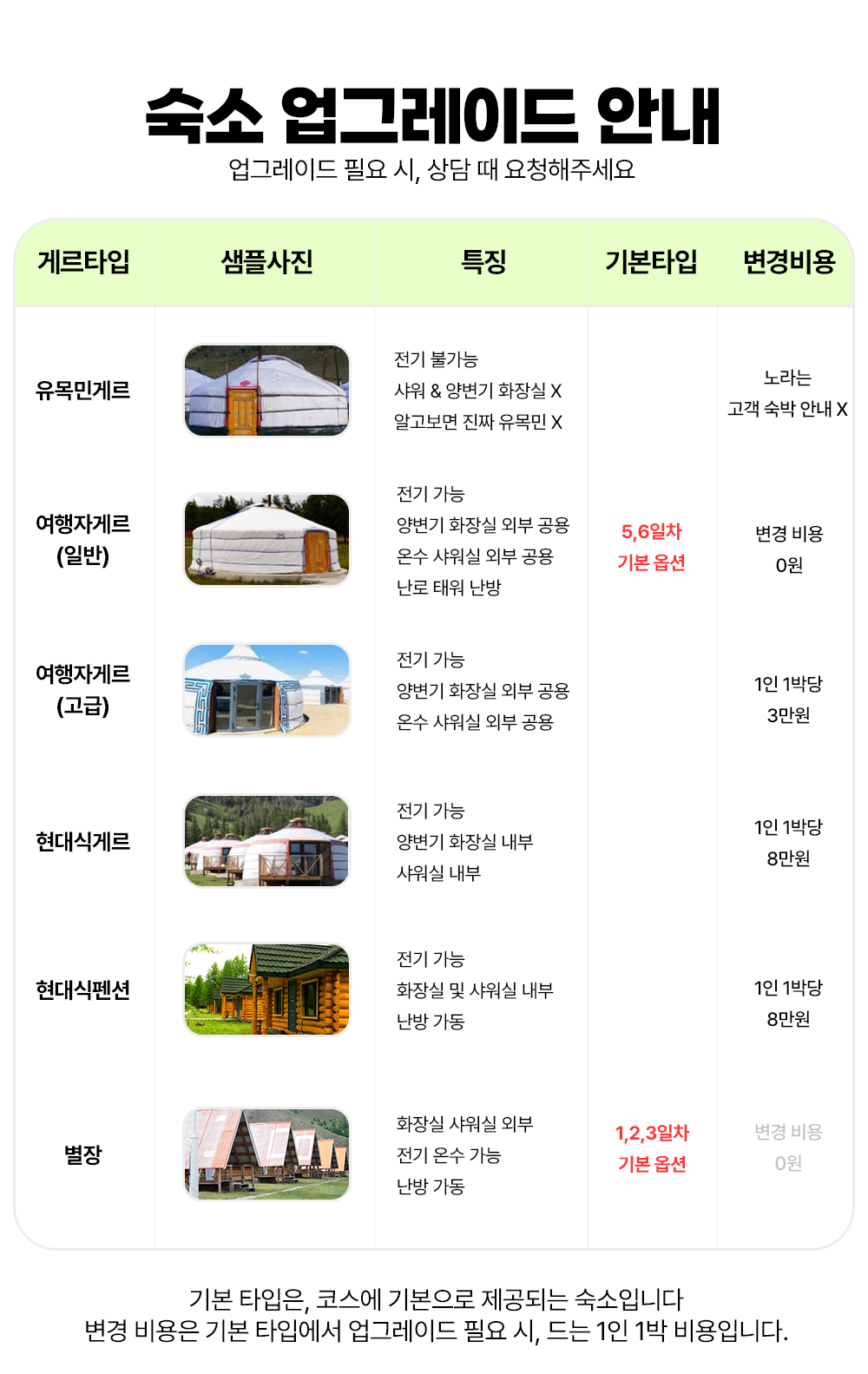 • 여행자 또는 여행사 책임 여부와 무관하게 여행 중 발생 가능한 사고·질병 등은 여행자보험으로 해결합니다. 투어 전 여행자보험 필수 가입을 권장하며, (말/낙타/ATV/말썰매/개썰매/얼음·눈썰매 등) 액티비티 특약 가입을 추천드립니다. 본 상품은 여행자보험 불포함 상품입니다.