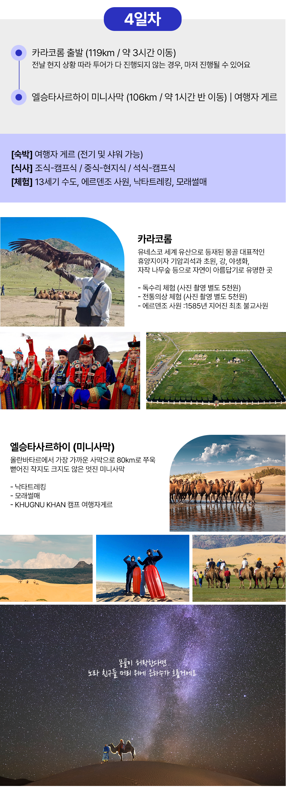 [체험] 13세기 수도, 에르덴조 사원, 낙타 트레킹, 모래썰매, 밤하늘 별과 은하수 감상 [식사] 조식:캠프식 중식: 현지식 석식:캠프식 [숙박] 여행자게르 (전기 가능&화장실 샤워실 외부 공용) 하르허링: 몽골 칭기스칸의 아들 우구데이 칸이 1235 년에 세운 몽골 제국의 옛 수도 ★ 독소리 체험 ★ 전통의상체험 (선택-만투그릭-4천원) ★에르덴조 사원: 1585년에 지어진 최초 불교사원 ->미니사막으로 이동 엘승타사르하이: 올란바타르에서 가장 가까운 80km로 뻗어진 미니사막 ★낙타트레킹 ★모래썰매 ★미니사막 KHUGNU KHAN 캠프 이용 ★여행자게르-일반 숙박 ★밤하늘 별빛 및 자유시간