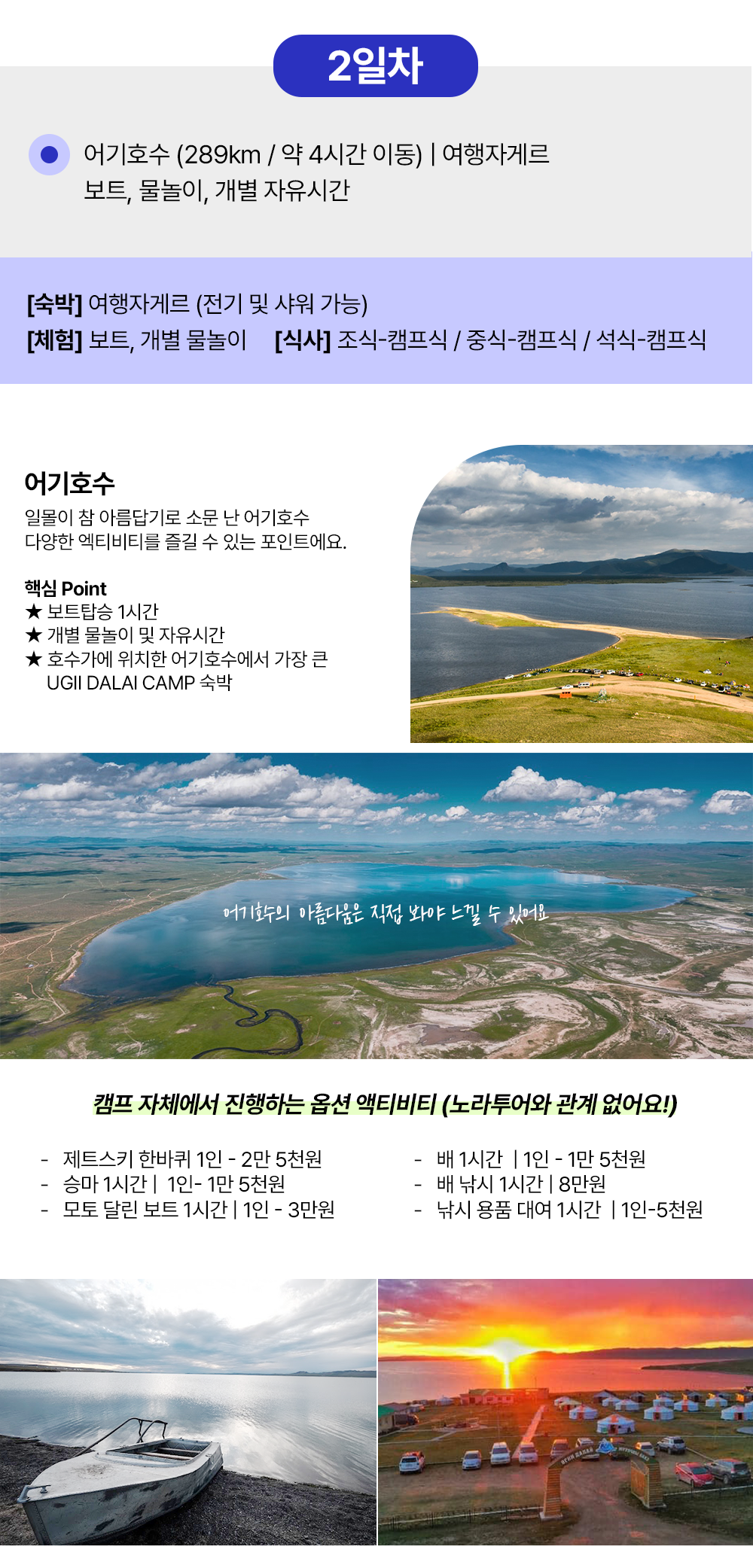 [체험] 보트, 물놀이 [식사] 조:캠프식 중식:캠프식 석식:캠프식 [숙박] 여행자게르 (전기 및 샤워 가능) ★보트탑승 (1 시간) ★개별 물놀이 및 자유시간 ★캠프에서 할 수 있는 옵션 액티비티 -제트스키 한바퀴 /1인-2만5천원/ -승마 1 시간 /1인- 1만5천원/ -모토 달린 보트 1 시간 /1인- 3만원/ -배 1 시간 /1인-1만5천원/ -배 낚시 1 시간 /8만원/ -낙씨 용품 대여 1 시간 /1인-5천원/ ★호수가에 위치한 어기호수에서 가장 큰 UGII DALAICAMP 숙박