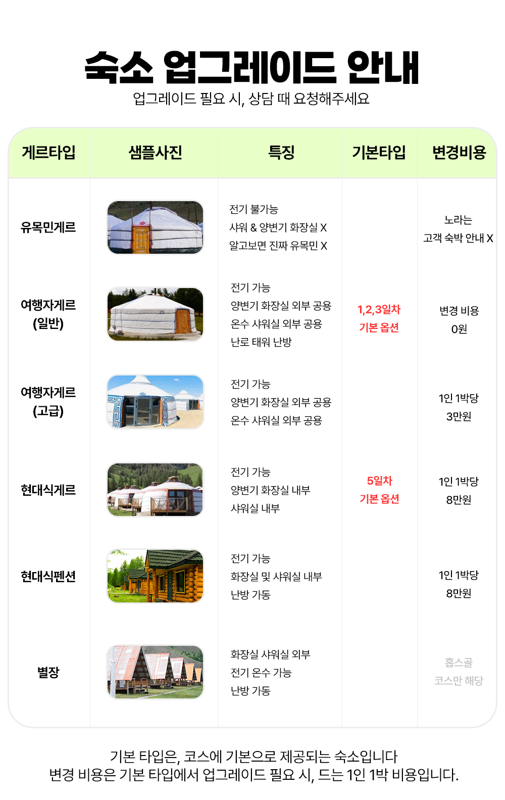 [체험] 야외 온천 [식사] 조:캠프식 중:현지식 석:캠프식 [숙박] 여행자게르 (전기 가능&화장실 샤워실 외부 공용) 쳉헤르온천: 초원 한가운데 야외 온천탕에서 밤하늘 별이 쏟아지는 관경을 보며 시원한 맥주를 즐길 수 있는코스입니다. 땅에서 솟아오르는 유황 온천으로 피부에 좋은 각종자연 미네랄이 풍부합니다. ★ DUUT RESORT 혹은 ★ SHIVEET MANKHAN 이용 ★여행자게르-일반 숙박 ★단독탕 있는 별채로 업그레이드 시 별도 문의(인원별 가격 상이) (샤워실 화장실 내부)