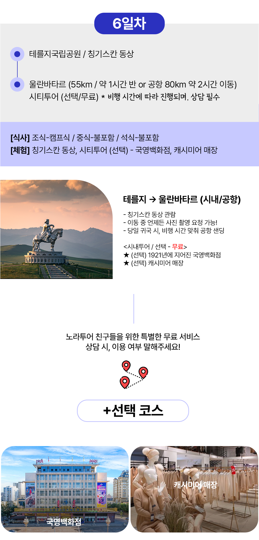 [식사] 조:캠프식 중,석:불포함 [체험] 칭기스칸 동상, 시티 선택코스 칭기스칸 동상: 높이 40미터 250톤 스테인리스로 제작된 초 거대한 동상 ★칭기스칸 동상 관람 ★ 시티투어(선택-무료) or 공항 샌딩 (선택코스) 국영백화점: 1921년에 지어진 국영백화점 (선택코스) 캐시미어 매장