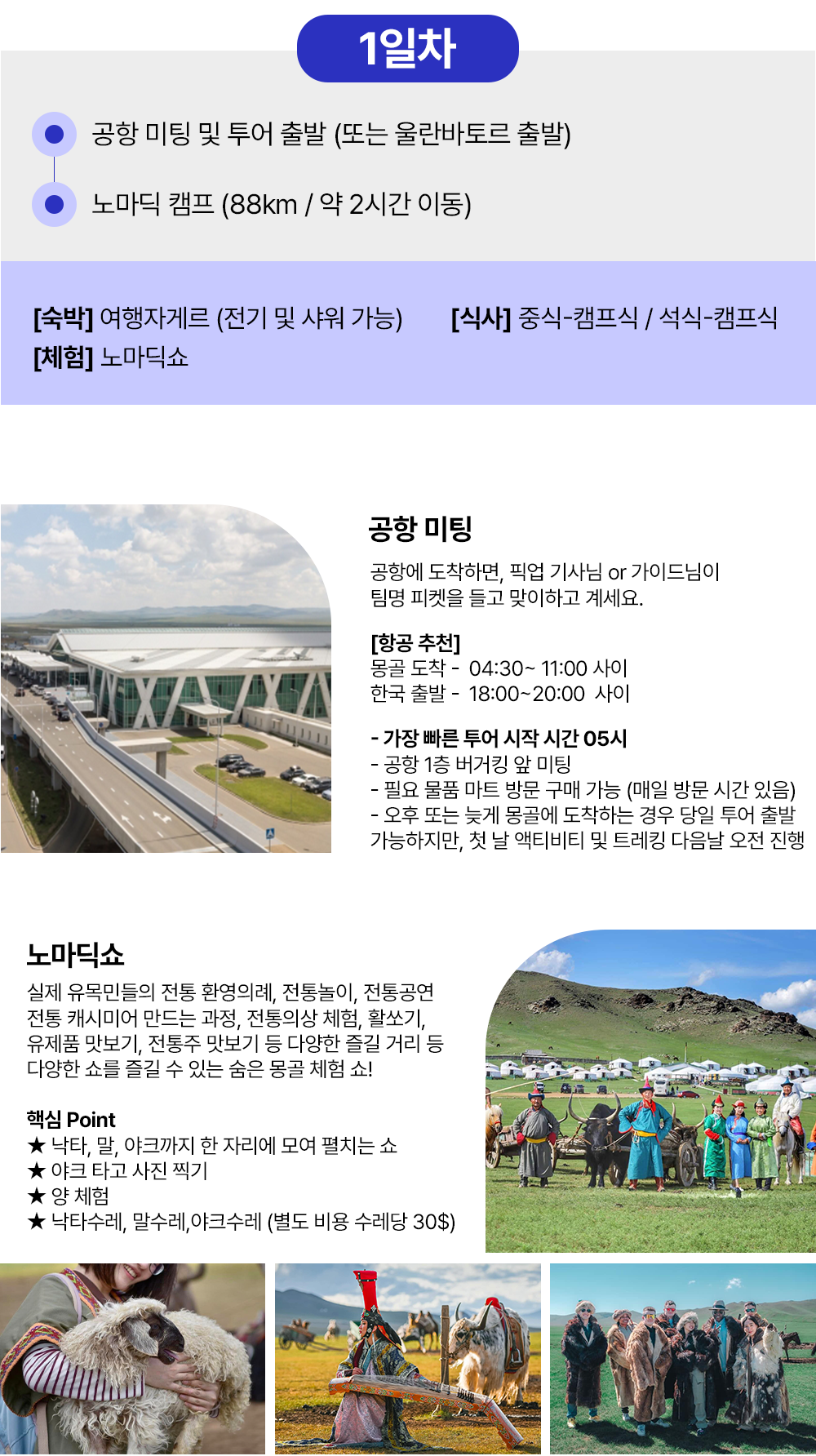 [체험] 노마딕 쇼 입장료, [식사] 중식:캠프식 석식:캠프식 [숙박] 여행자게르 (전기 및 샤워 가능) 노마딕 쇼: 실제 유목민들의 전통 환영의례, 전통놀이,전통 캐시미어 만드는 과정, 전통공연, 전통의상 체험, 활쏘기, 유제품 맛보기, 전통주 맛보기 등 다양한 즐길 거리 ★낙타, 말, 보기 힘든 야크까지 한지리에 모여 펼치는쇼 ★야크 타고 사진 찍기 ★몽골 전통 공연 관람 ★전통 털 옷 만드는 과정 ★ 양 체험 ★게르 만드는 과정 ★전통 의상 체험 (제국 시대 즐겨 입던 털로 만든 옷) ★낙타수레, 말수레,야크수레 (별도 비용 수레당 30$) ★여행자게르 숙박