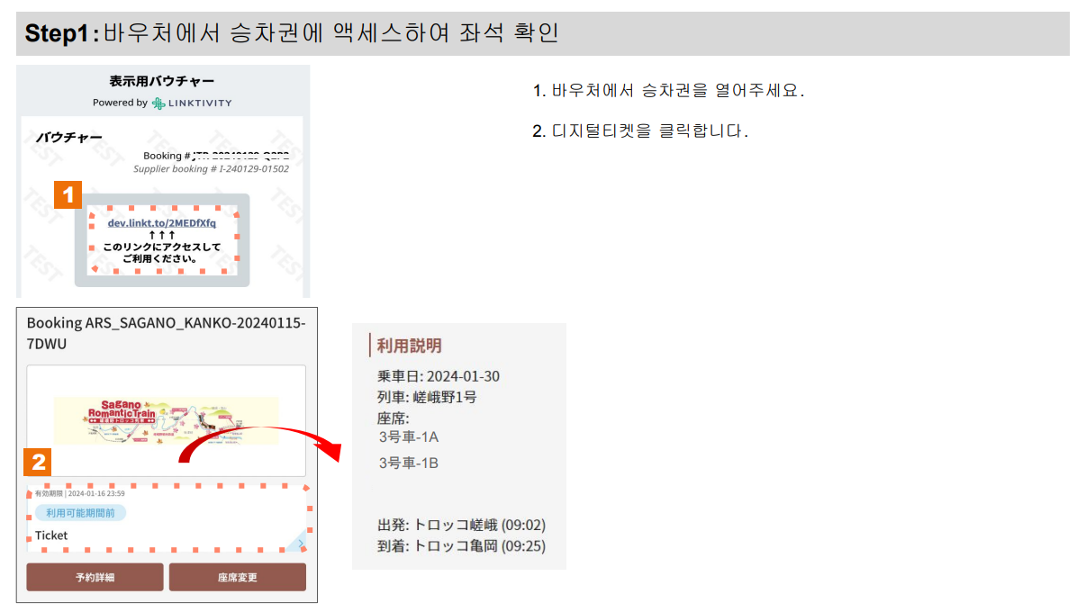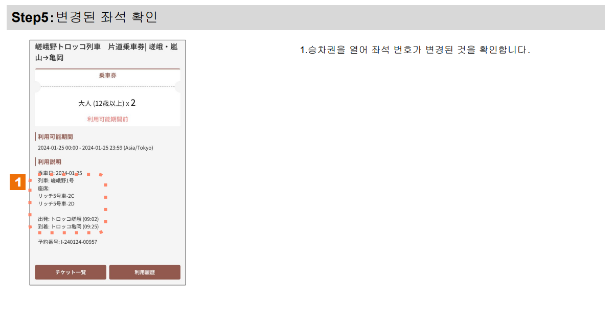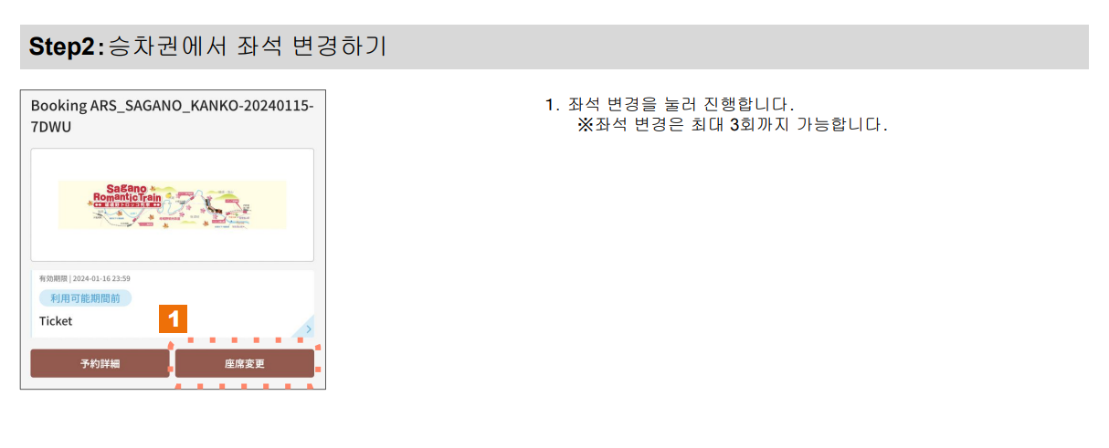 - 이용당일 지정한 승차시간까지 역 개찰구의 직원에게 시간과 좌석이 표시된 바우처 화면을 제시한 뒤 이용해 주세요. - 별도 실권교환없이 바우처 화면 제시하여 이용 가능합니다. 모바일 캡쳐본은 사용이 불가 합니다. - 만약 현장에 직원이 부재인 경우에는 예약한 좌석에 그대로 착석해 주세요. - 이용좌석은 시스템에서 랜덤으로 배정되므로 같이 예약한 건이라도 좌석이 붙어있지 않을 수 있습니다. - 좌석변경을 원하시는 경우에는 손님이 직접 바우처를 통해 좌석을 변경해 주세요. *좌석 변경 방법