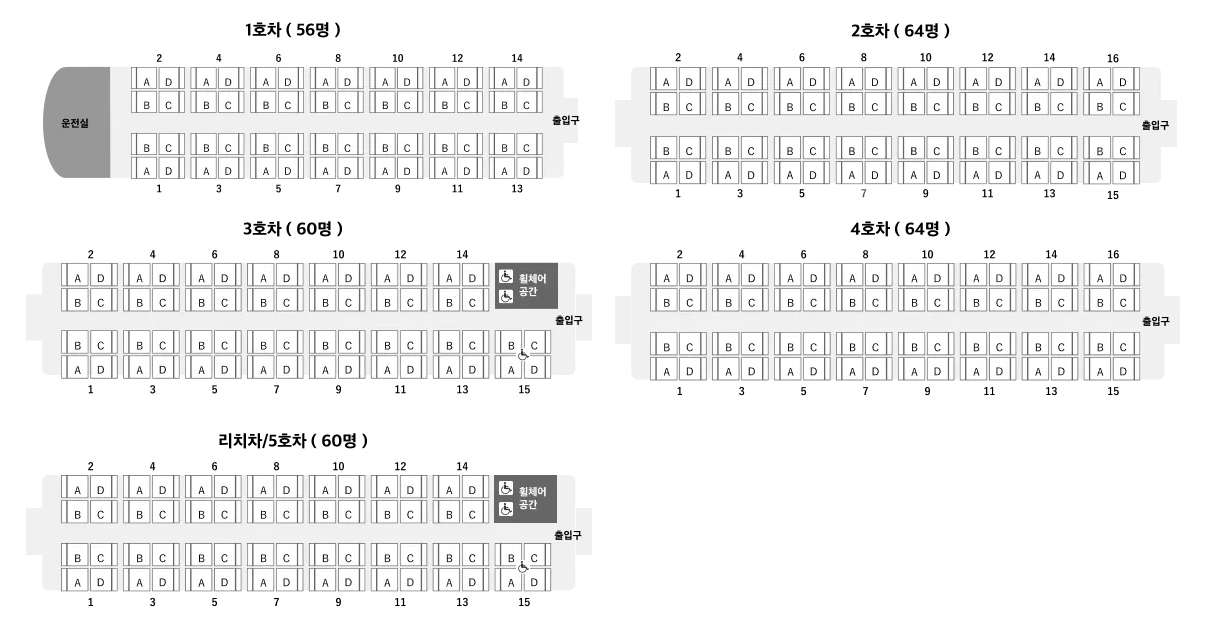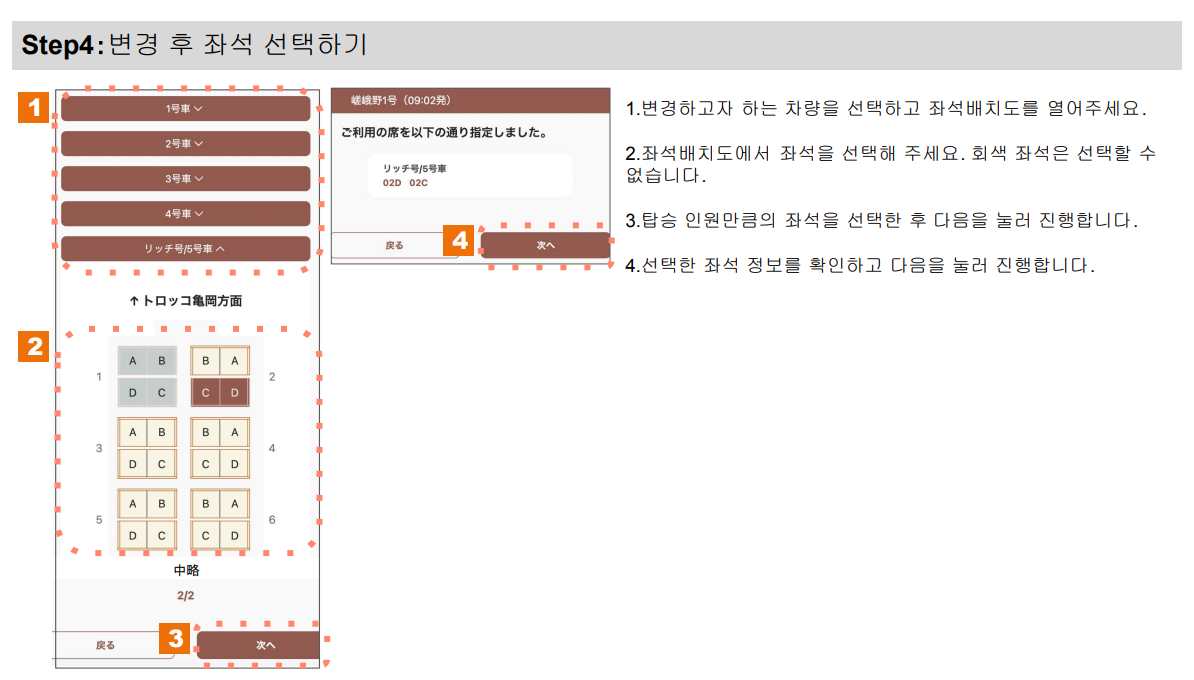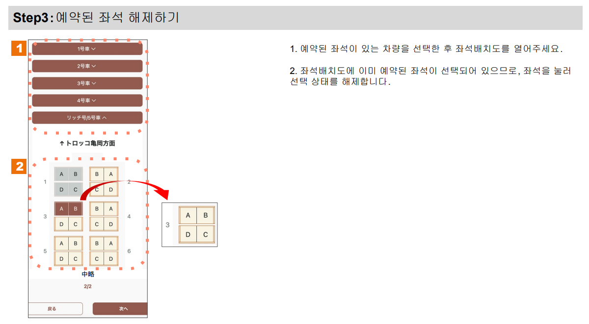 풍경을 잘 보고 싶다면 짝수번호 예약! 토롯코 관광열차는 한 개의 열차선이 있기때문에 열차를 돌릴 수 없어 열차 모양을 그대로 유지한테 앞뒤로 움직인답니다. 홀수번호는 벽 쪽을 보는 경우가 있기 때문에 짝수로 예약을 추천 합니다. 열차방향 가메오카행: 정방향 C/D , 역방향 A/B 사가행: 정방향 A/B, 역방향 C/D 원하는 방향에 따라 좌석을 선택하세요 5호차 '더 리치호'에는 유리창이 없는 좌석입나다.
