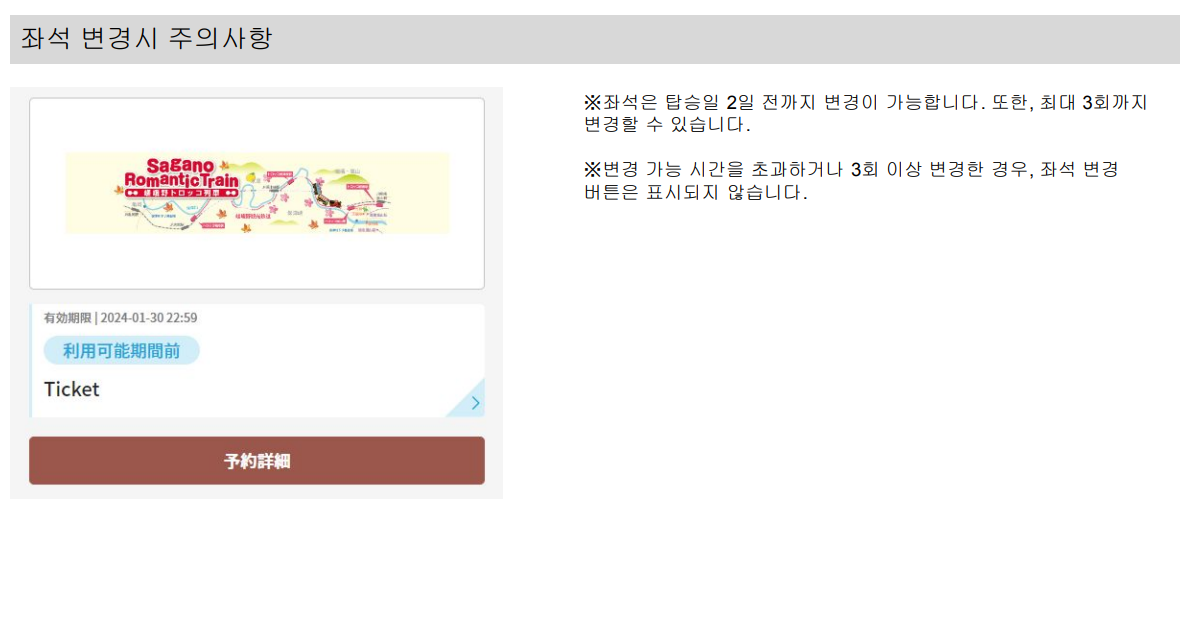 1. 이 상품은 자동예약 상품입니다. 당일예약 당일이용 가능합니다. 2. 구매일로부터 28일이내의 날짜를 예약할 수 있습니다. 3. 바우처의 유효기간은 지정일 당일입니다. 4. 지정일 2일전까지 무료취소 가능합니다. 이후 취소불가. (ex. 지정일이 1/19인 경우, 1/17의 23:59(일본시간)까지 무료취소가능) 5. 6세이상 승객 1명당 영유아 1명을 무릎 위에 앉히는 경우, 무료로 이용 가능합니다. 단, 좌석이 필요한 경우에는 아동 티켓을 구매해 주세요. (영유아=만6세미만) 6. 예약 후 이용일 변경 불가합니다. 이용일 변경을 원하시는 경우에는 지정일 2일전까지라면 무료 취소후 재구매해주세요. 7. 예약 후 좌석변경 가능합니다. 좌석은 지정일 2일전까지 변경 가능하며 3번까지 변경 가능합니다. 손님이 직접 변경하실 수 있습니다. 8. 좌석 변경 가능한 시간이 지났거나, 변경 횟수를 초과한 경우 좌석변경 버튼은 표시되지 않습니다. 9. 빈 자리가 있는 경우, 5호차(리치호)로 좌석 변경할 수 있습니다. 10. 구매시 지정한 방향으로만 이용 가능합니다. 역방향 이용 불가하므로 구매시 유의해 주세요. 11. 이용구간 내 도중 하차 가능합니다. 단, 한번 하차하시면 재승차 불가합니다. 12. 해당 상품은 편도 상품입니다. 왕복 상품을 원할 시 각각의 편도 상품을 구매해주세요 13. E-티켓 모바일 캡쳐본은 사용이 불가 합니다.