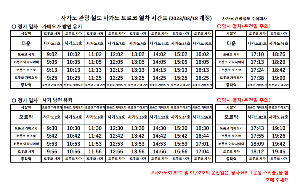 -토롯코 사가역 〒616-8373 京都府京都市右京区嵯峨天龍寺車道町 Saga Tenryuji Kuramichicho, Ukyo Ward, Kyoto City, Kyoto Prefecture 616-8373 - 찾아오는 길: JR 이용 시: JR 산인본선(사가노선) 「사가 아라시야마역」하차 후 남쪽 출구에서 도보 약 1분 란덴(嵐電)(게이후쿠전철 아라시야마본선) 이용 시: 란덴(嵐電)「란덴 사가역」하차 후 도보 약 5분 한큐 전철 이용 시: 한큐 아라시야마선 「아라시야마역」하차 후 도보 약 20분 - 토롯코 가메오카역 〒621-0825 京都府亀岡市篠町山本神田 Shinden Shinochoyamamoto, Kameoka, Kyoto 621-0825 - 찾아오는 길: JR 이용 시: JR 산인본선(사가노선) 「우마호리역」하차 후 도보 약 10분