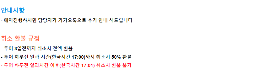 • 투어 3일 전 취소(한국시간 17시까지): 전액 환불