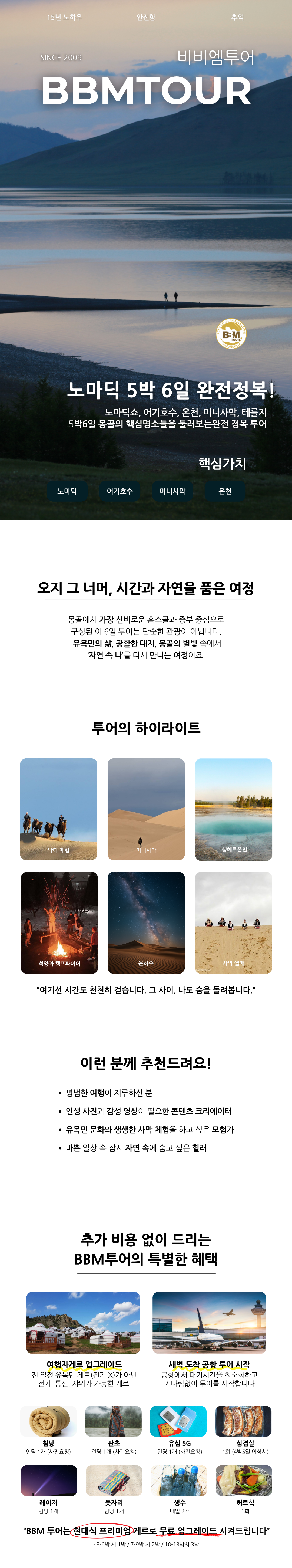 안녕하세요, BBM투어입니다. 저희는 2009년도에 설립하여 15년의 경험과 노하우를 바탕으로 안전하고 편안한 여행을 위해 최선의 서비스를 제공하고 있는 전문 여행사입니다. 몽골의 아름다운 자연, 유목민들의 생활과 문화를 체험하러 오시는 방문자 여러분! 저희 BBM투어는 여러분을 기다리고 있으며 여행 동반자로서 아름다운 추억의 시작과 끝을 함께하고, 안전하며 만족스러운 여행으로 보답하겠습니다. 파트너 상품보기