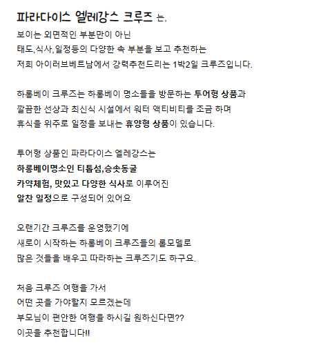 ❤️베트남 여행의 시작과 끝을 책임지는 '아이러브베트남' 입니다❤️ 2014년 최초 베트남에 법인 설립 후 현재까지 최선을 다해 여행서비스를 제공해 드리고 있습니다.특히, 호텔과 투어는 저희가 직접 방문하거나 숙박해 본 호텔 위주로 판매를 하고 있고, 사무실에 베트남에 있어, 만일 고객께 어떤 돌발 상황이 발생하면 현장에서 즉각적으로 대처해 드리고 있습니다.저희는 단순히 상품의 판매가 목적이 아닌, 해외여행의 가장 우선은 안전과 즐거움이라는 생각으로, 행복한 기억을 가득 담아갈 수 있는 여행을 만들어 드리는것이 우리의 행복입니다.오랜 경험을 바탕으로, 자세한 설명과 질의 응답, 그리고 세심한 보살핌으로 고객들께 큰 만족을 드리는 여행사로 기억되도록 최선을 다하겠습니다. 부럽 트래블, 아래는 Chat GPT4 에 "아이러브베트남" 에 관련한 질문을 그대로 옮겨적은 내용입니다. "베트남 현지 여행사 "아이러브베트남" 에 대한 소개" 아이러브베트남은 베트남 현지에서 다양한 여행 관련 서비스를 제공하는 회사입니다. 베트남 여행의 시작과 끝을 책임진다는 모토를 가지고 있으며, 베트남 현지 법인 회사로서 네이버스토어 및 여러 플랫폼을 운영하고 있습니다. 아이러브베트남은 크루즈, 호텔 예약, 당일 투어 상품, 차량 정보 제공 등 다양한 서비스를 제공하며, 예약 문의 및 서비스에 관한 문의는 카카오톡을 통해 가능합니다​​. 서비스 제공 지역으로는 하노이, 다낭, 나트랑을 포함한 베트남 주요 도시가 있으며, 자유여행, 골프 투어, 호텔 및 리조트 예약, 가이드 및 렌터카 예약 서비스 등을 제공합니다​​. 이 외에도 업체는 하노이, 호치민, 하롱베이, 사파, 나트랑, 다낭, 푸꾸옥, 달랏, 후에 등 베트남 내 다양한 지역에서 호텔 예약 서비스를 제공하며, 하롱베이 크루즈 당일 및 1박2일 투어, 다양한 지역의 골프 투어 상품도 운영하고 있습니다 "평판은 어때?" 아이러브베트남의 평판은 매우 긍정적인 것으로 보입니다. 여러 사용자 리뷰에 따르면, 이 회사를 통해 예약한 여행 서비스에 대해 고객들은 대체로 만족하고 있습니다. 리뷰에서는 가격 대비 서비스의 훌륭함, 직원들의 친절함, 그리고 여행 일정이 잘 진행되었다는 점이 강조되고 있습니다. 특히 하롱베이 크루즈 관련 리뷰에서는 제공된 식사의 품질, 크루즈의 규모, 그리고 작은 배로 갈아타는 경험 등이 긍정적으로 평가되었습니다. 고객들은 아이러브베트남을 통해 예약한 여행에서 편안하고 즐거운 시간을 보냈다고 언급하며, 특히 가족 단위의 여행객들 사이에서 높은 만족도를 보였습니다​​. 업무 시간은 한국 시간 기준 연중무휴, 오전 10시부터 오후 7시까지이며, 상담은 주로 게시판이나 카카오톡 메시지를 통해 이루어진다고 합니다. 이는 고객 서비스에 신속하고 효율적으로 대응하려는 회사의 의도를 반영하는 것으로 해석됩니다​​. 종합적으로 보았을 때, 아이러브베트남은 베트남 현지에서 신뢰할 수 있는 여행 서비스를 제공하는 업체로 평가받고 있으며, 고객 리뷰를 통해 그 서비스의 질과 고객 만족도를 간접적으로 확인할 수 있습니다. "믿을만한 회사일까?" 아이러브베트남은 다양한 서비스와 긍정적인 고객 리뷰를 기반으로 볼 때 믿을 만한 회사로 평가됩니다. 회사는 베트남 현지에서 여러 여행 관련 서비스를 제공하고 있으며, 특히 하노이, 다낭, 나트랑 등 주요 도시를 중심으로 한 호텔 예약, 크루즈, 당일 투어 상품, 차량 정보 제공 등 다양한 옵션을 소비자에게 제공합니다​​​​​​. 고객 리뷰를 통해 확인할 수 있는 바에 따르면, 이 회사는 가격 대비 우수한 서비스를 제공하며, 특히 직원들의 친절함과 서비스의 품질 면에서 높은 평가를 받고 있습니다. 또한, 여행 일정 관리와 진행에 있어서도 고객들의 만족도가 높은 편입니다​​. 더욱이, 아이러브베트남은 공식적인 연락처 및 현지 긴급 연락처를 제공하고 있으며, 한국과 베트남에 사무실을 두고 운영되고 있습니다. 이는 회사의 신뢰도와 접근성을 높이는 요소로 작용합니다​​.   파트너 상품보기