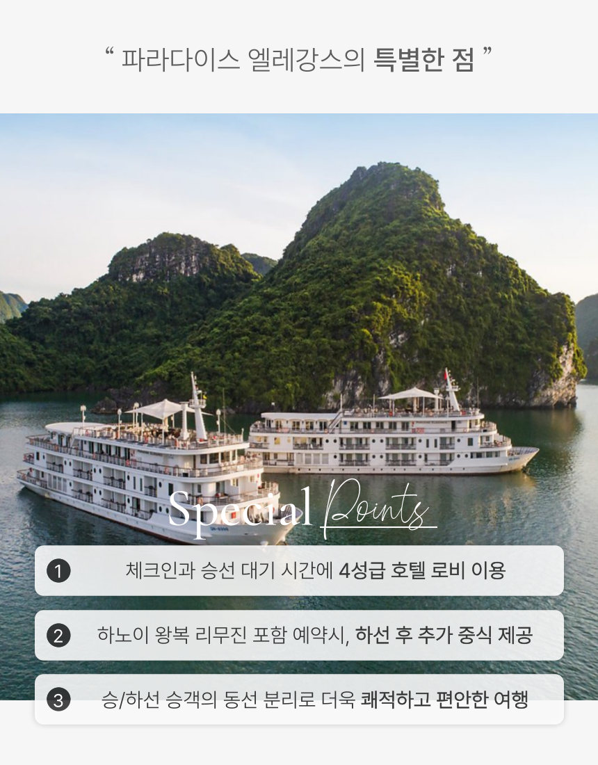 [하롱베이] 파라다이스 엘레강스 크루즈 하롱베이 하노이 왕복리무진 포함 #투어형