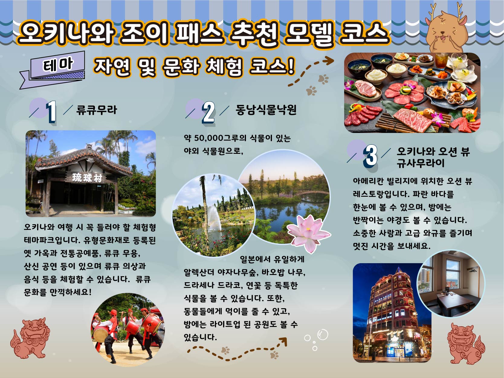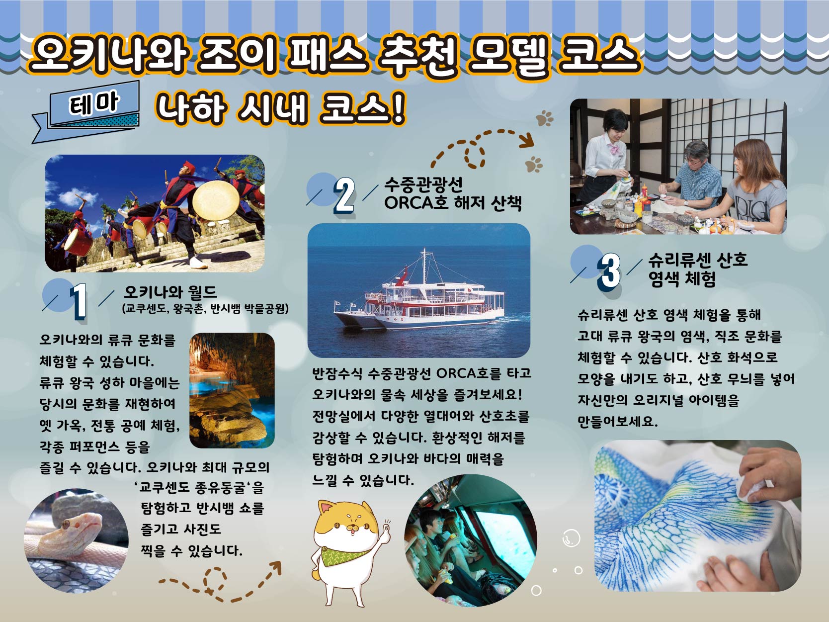 오키나와의 여러 관광지를 둘러보고 싶은데 미리 다 예약하자니 바우처 관리가 번거롭고 비싸다고 생각되시는 분에게 추천드립니다. 일주일동안 츄라우미 수족관을 비롯하여 다양한 체험시설과 테마파크 중 원하시는 시설 3곳을 선택하여 이용할 수 있습니다. ※8월 7일 부터 이용가능한 시설이 추가 됩니다. 1.오키나와 미바루 해저 관광 글라스보트 1000엔 할인 ※ 츄라우미 수족관은 3/31까지 교환 및 이용가능하며, 4/1부터 교환 및 이용하실 수 없습니다. 영상보러가기