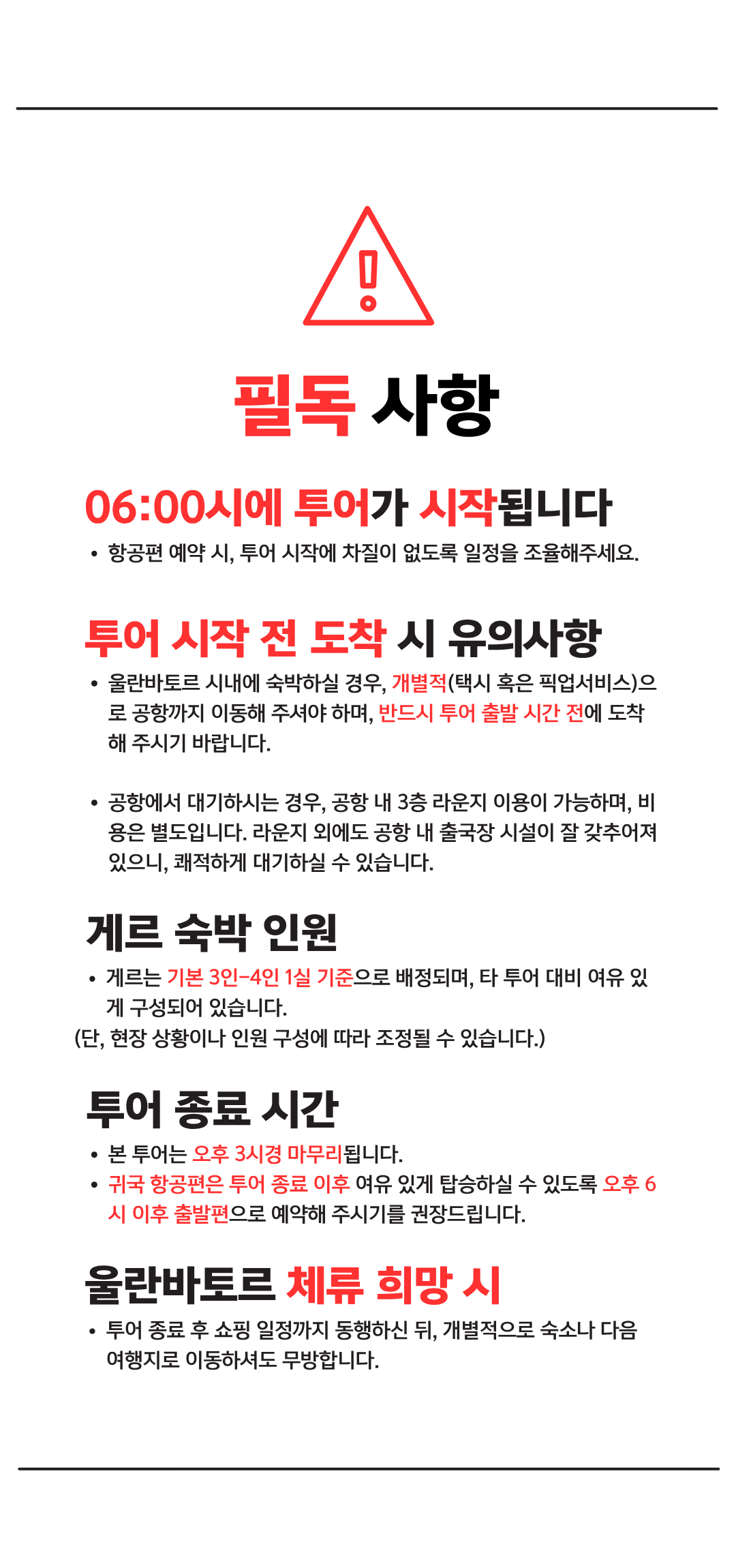 - 투어시작 30일 전 취소 시 100% 환불 가능 - 투어시작 15일 전 취소 시 50% 환불 가능 - 그 이후 취소 시에는 환불이 불가하니 신중한 구입 부탁 드립니다.