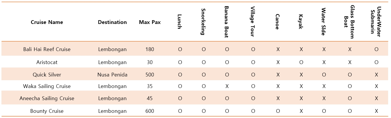 발리를 출발해서 발리의 오른쪽에 있는 램봉안(또는 누사페니아)섬을 가는 투어. 종류도 많고 배도 많습니다. 자 이제 트래블포레스트가 이 모든 크루즈 투어들을 요약정리하겠습니다. 원하시는 스타일의 여행을 준비하세요.