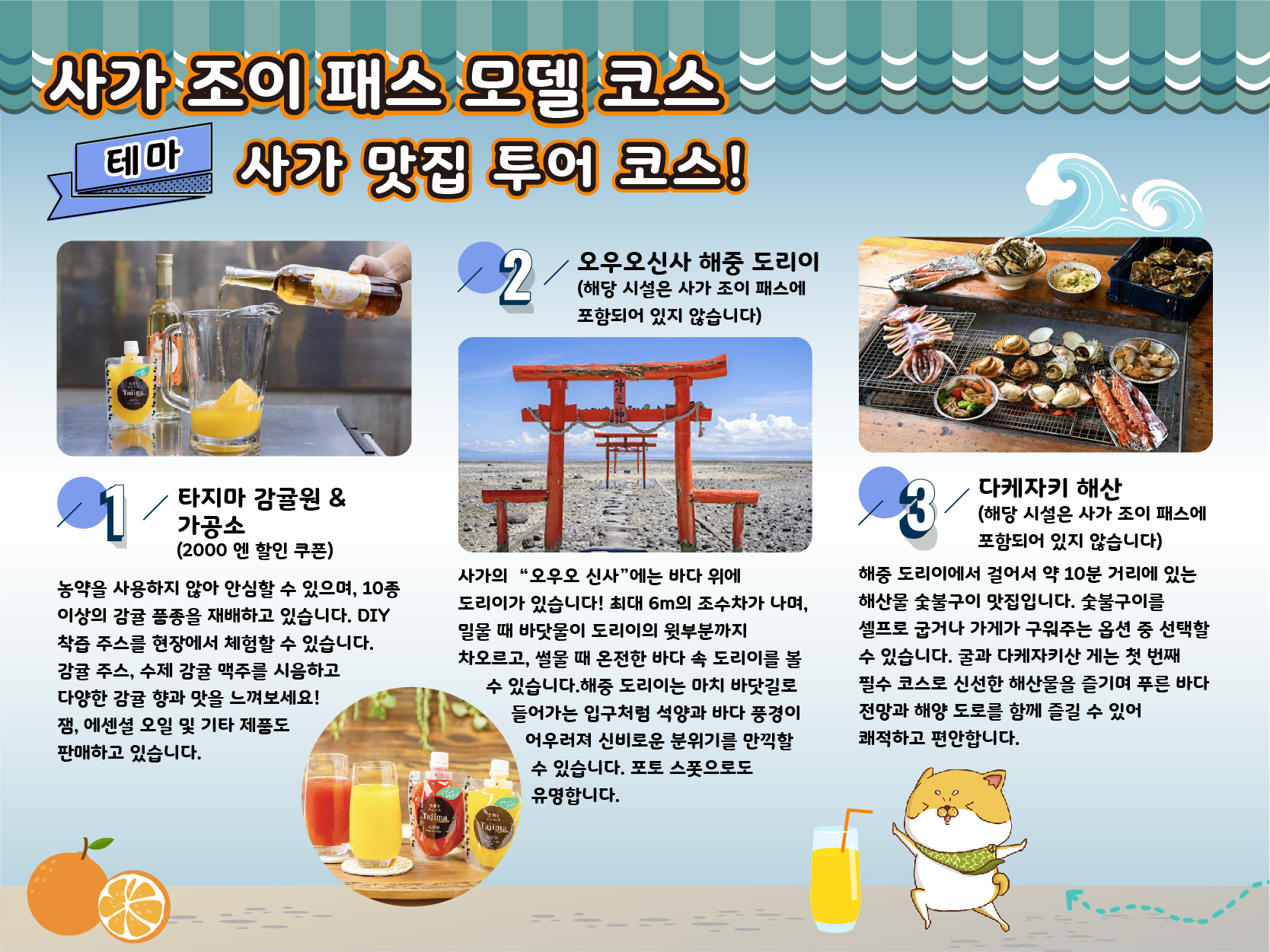 사가 지역의 매력적인 관광지와 인기 시설을 대상으로 한 가성비 티켓, 사가 조이 패스! 유효기간 내에 대상 시설 중에서 원하는 시설 3곳을 선택하여 할인 혜택을 받으실 수 있습니다. 바우처의 QR코드 1개만으로 모든 시설을 이용할 수 있어, 티켓 관리도 매우 간편합니다.