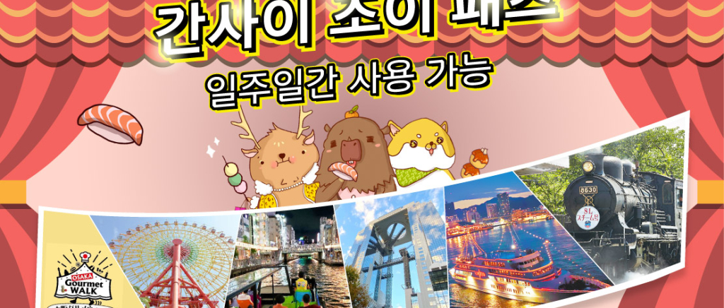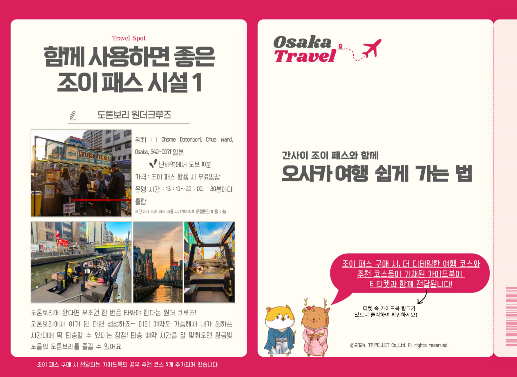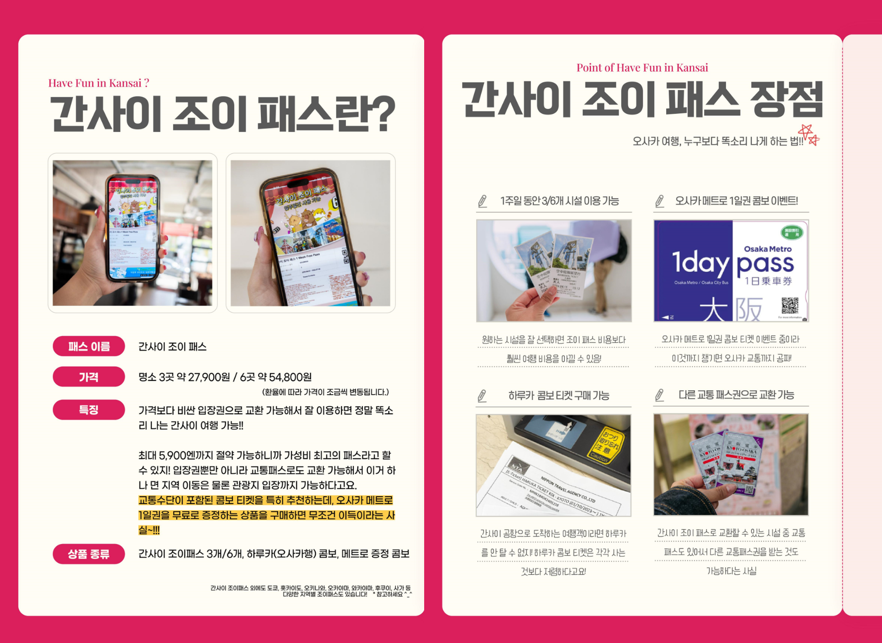 일주일 간 간사이 주요 시설 3곳 or 6 곳 선택! 일본의 오사카, 교토, 고베, 나라 등의 도시가 위치한 간사이 지역을 여행하는 분들에게 유용한 관광패스 🎫 한 개의 QR코드를 모바일에 저장해서 보관도 편리합니다. 다양한 시설들을 일주일 동안 3곳 또는 6곳의 시설을 저렴한 가격으로 이용할 수 있습니다! 야경부터 시작하여, 먹거리, 교통, 패러글라이딩까지 다양한 장르의 상품을 이용할 수 있습니다. 저렴한 가격으로 간사이 지역 명소를 입장할 수 있을 뿐만 아니라, 식당, 기념품, 교통까지 폭 넓은 혜택을 받아보세요 *간사이 조이 패스로 이용 가능한 추천 여행 상품 [체험시설] [오사카] ① 쓰텐카쿠 입장권 ② 쓰텐카쿠 "TOWER SLIDER" 티켓 ③ 쓰텐카쿠 Dive & Walk 2000엔 할인 ④ 오사카 원더 크루즈(17시 이후 운행편만 이용 가능합니다.) ⑤ 산타마리아 데이 크루즈 승선권 (동계시즌 특별운휴일: 25.02.19-25.02.20 ) ⑥ 우메다 스카이 빌딩 공중정원 전망대 입장권 ⑦ 하루카스 300 전망대 ⑧ 레고랜드 디스커버리 센터 오사카 입장권 (사전예약이 필요합니다.) ⑨ 소라니와온천 OSAKA BAY TOWER (A, B 요금 날짜만 이용이 가능합니다.) ※소라니와온천이용 불가일 ❎2025년 4월: 5일, 6일, 12일, 13일, 16일, 19일, 20일, 26일, 27일, 29일 ❎2025년 5월: 3일, 4일, 5일, 6일, 14일, 24일, 25일 ❎2025년 6월: 11일, 15일, 21일, 22일, 28일, 29일 ※이용 가능 일자는 링크를 참고해 주세요. 이용날짜 확인하기 [고베] ⑦ 고베 누노비키 허브가든 & 로프웨이 입장권 왕복 ⑧ 모자이크 대관람차 [교토] ⑨ 교토 철도 박물관 ⑩ 도에이 우즈마사 영화촌 입장권 [쇼핑] [오사카] ① 오사카역 쇼핑센터 "LUCUA osaka" 공통 상품권 1000엔 ② 오사카역 쇼핑센터 "EKI MARCHE 오사카" 공통 쿠폰 1000엔 ③ 덴노지 MIO 쇼핑몰 공통 쿠폰 1500엔 (2023.9.1~2024.9.30) [맛집] [오사카] ① 오사카 레스토랑 플로어 "16 Gourmet" 식사권 1300엔 ② 298 야키니쿠 1000엔 할인 ③ 노노토리 1000엔 할인 ④ 기타신치 쿠시카츠 본 1000엔 할인 ⑤ 아베노다코야키 야마짱 유니버설 시티워크 오사카점 1000엔 할인 ⑥ 다코야키 다마야 유니버설 시티워크 오사카점 1000엔 할인 ⑦ 오사카 아메리카무라 고가류 유니버설 시티워크 오사카점 1000엔 할인 ⑧ Dotonbori Grill & Bar Wonder 1000엔 할인 ⑨ 스키야키 샤부샤부 만스이야 1000엔 할인 ⑩ ABURIYA arata KITTE OSAKA 1000엔 식사 할인 [고베] ⑩ 톤톤 돈카츠 1000엔 할인 (세트메뉴 이용) [교토] ⑪ 카니카니랜드 교토기온점 1000엔 할인 [교통] [오사카] ① 오사카 공유 자전거 1일 패스 (IC카드 포함) [교토] ② 게이한 전철 오사카-교토 1일권 ③ 교토 아라시야마 미식 투어 쿠폰 + 란덴 1일 승차 가이드북 링크 이용가능시설 구글맵 영상보러가기